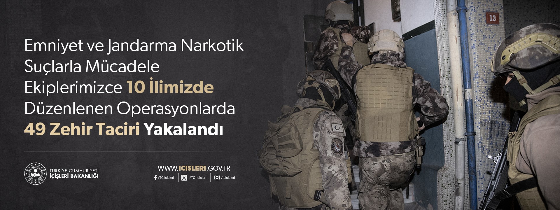 10 ilimizde düzenlenen narkotik operasyonlarda çok sayıda muhtelif miktarda uyuşturucunun yanı sıra aralarında sokak satıcılarının da olduğu 49 zehir taciri yakalanarak gözaltına alındı.