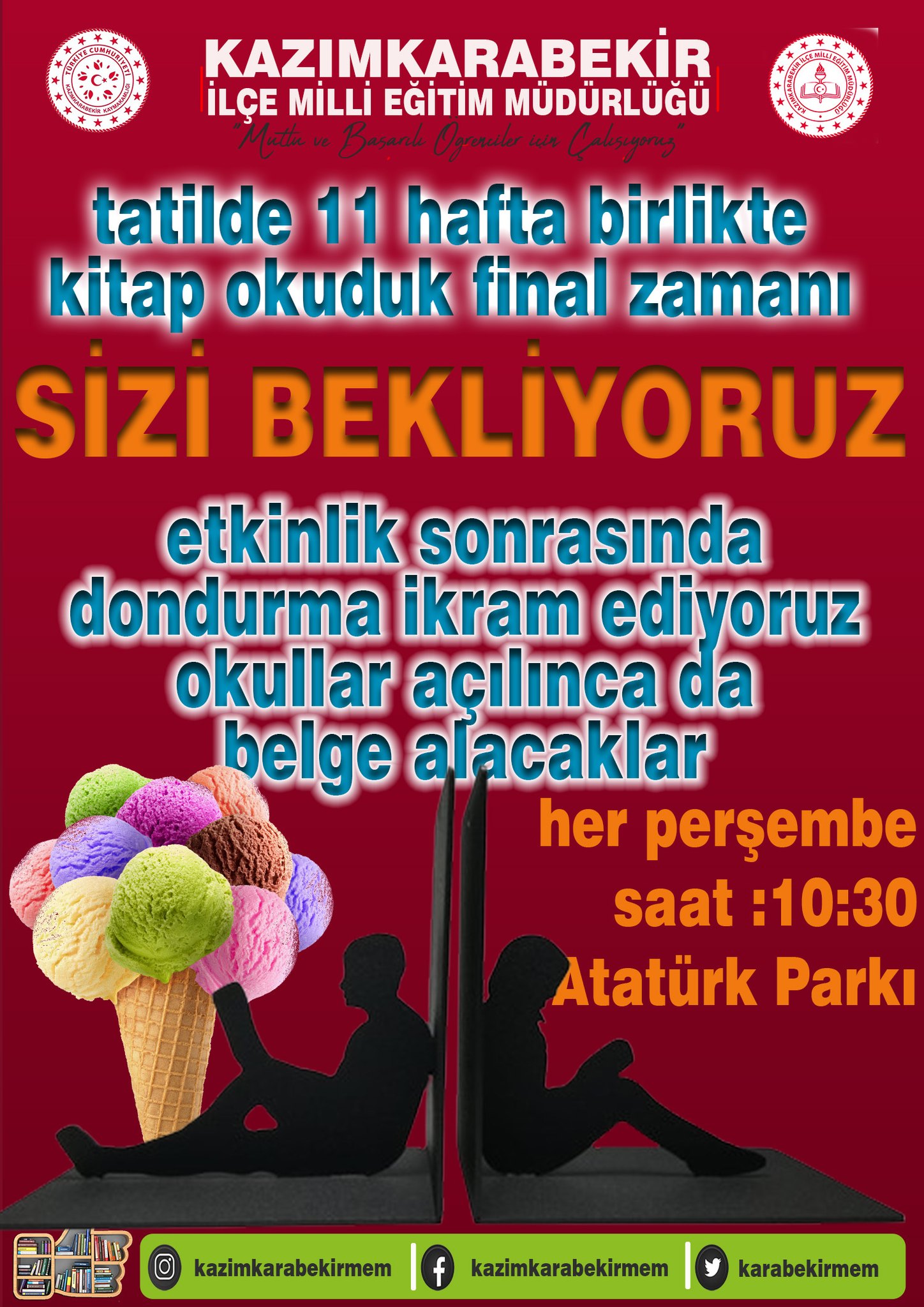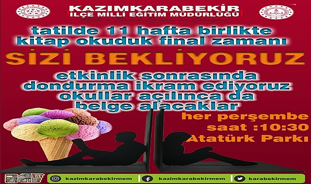Kazımkarabekir Milli Eğitim Müdürlüğü’nce okul döneminde ilçe genelinde uygulanan “Paşa Torunları 70 Dakika Okuyor” projesi ile öğrencilerde kitap okuma sevgisi ve alışkanlığı kazandırıldı. Bu alışkanlığın yaz tatilinde de devam etmesi için her perşembe öğrenciler ve Milli Eğitim Müdürü birlikte kitap okuyor.Yaz tatili süresince 11 hafta devam eden etkinlik bu hafta final yapıyor. İlçe Merkezi Atatürk parkında her hafta olduğu gibi bu perşembede Milli Eğitim Müdürü ve öğrenciler birlikte kitap okuyacaklar.Milli Eğitim Müdürü Mustafa Eryiğit: “evlatlarımıza kitap okuma sevgisi kazandırmak için okul döneminde sınıfta ve evlerinde ailecek kitap okuyan öğrencilerimiz tatilde de kitap okumaya devam etsinler istedik. Bunu sağlamak için de tatilin başlaması ile birlikte her hafta perşembe 10:30 da bir araya geldik Bu hafta onbirincisini gerçekleştirdiğimiz etkinlikte öğrencilerimiz ile buluşacağız. Ailecek evde kitap okumaya katkı sunan aileler çocuklarının ellerinden tutup kitap okumaya getirmeleri bizleri çok sevindiriyor.Etkinliğin son haftasında kitabı biten evlatlarımıza kitap hediye etmeye, sonrasında dondurma ikram etmeye devam edeceğiz. Katılan öğrencilerimiz okullar açıldığında okullarında belge ile ödüllendirileceklerdir.Tatil boyunca süren ve bu hafta final yapacağımız etkinliğimize öğrencilerimizi bekliyorum. Siz yeter ki okuyun kitaplar ve dondurmalar benden.Çocuklarını getiren anne babalara çok teşekkür ederim.” dedi.
