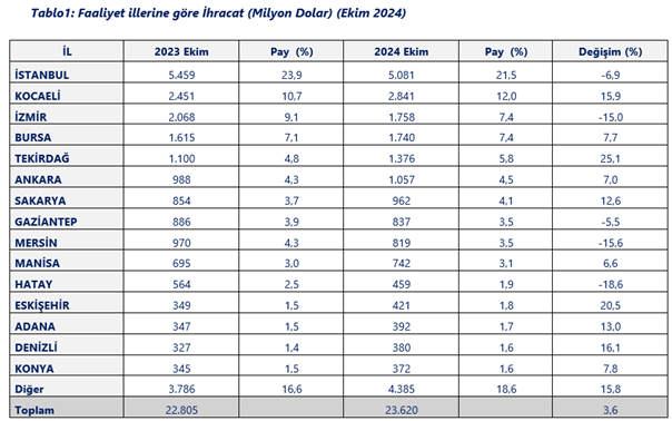 Ticaret Bakanlığının Faaliyet İlleri Bazında İhracat Sıralamasında, 2024 Ocak Ekim Döneminde 29 İli 1 Milyar Doların Üzerinde İhracat YaptıTicaret Bakanlığı;''2024 yılı Ekim ayında geçen yılın aynı ayına göre faaliyet illeri bazında ihracatta