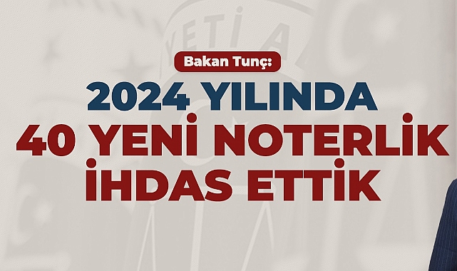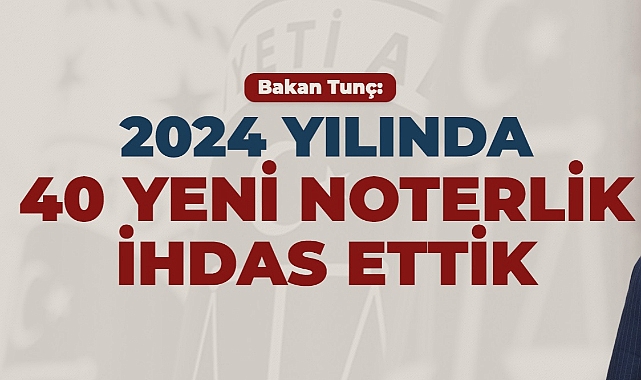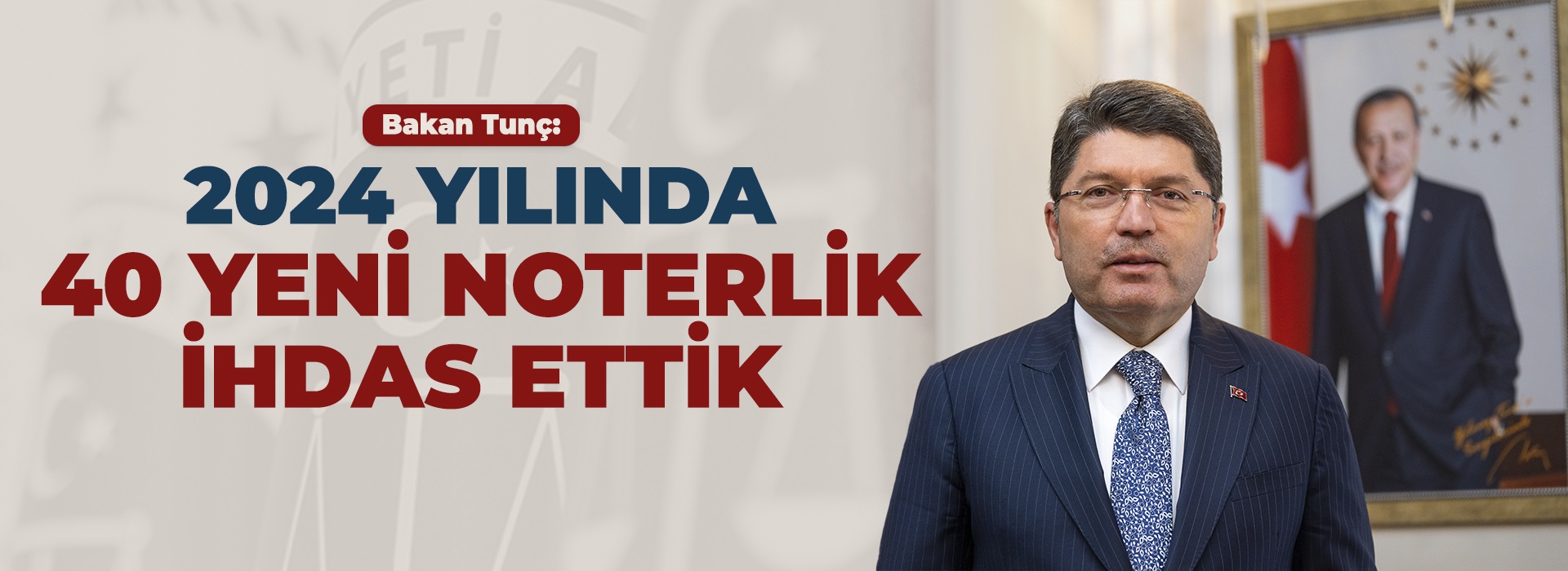 Adalet Bakanı Yılmaz Tunç, noterlik hizmetinin adalete erişimin önemli bir parçası olduğunu belirterek, “2024 yılında 40 yeni noterlik ihdas ettik. 2002 yılında 1.231 olan noterlik sayısını 2 bin 383’e yükselttik. Noterlik kurumunu daha üst seviyelere çıkarmak ve daha kaliteli hizmet sunabilmelerini sağlamak amacıyla çalışmalarımıza hız kesmeden devam edeceğiz.” dedi.