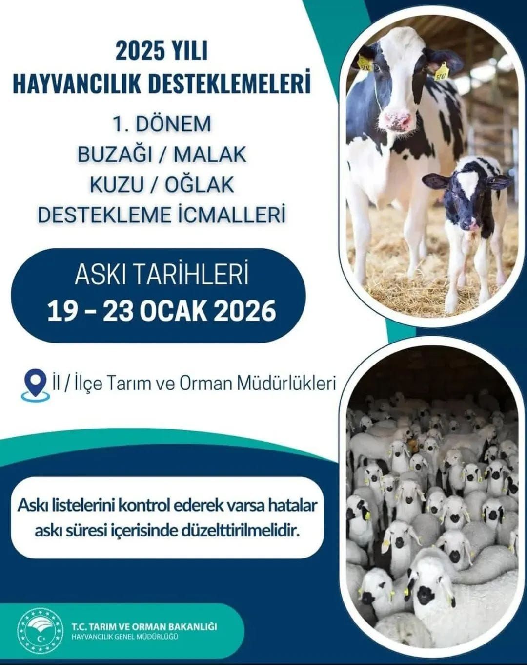 2025 yılı 1. dönem kuzu/oğlak ve buzağı desteklemelerine ait askı icmalleri yayımlandı. Tarım ve Orman İl Müdürlüğü tarafından yapılan duyuruda, destekleme kapsamında yer alan üreticilerin icmalleri dikkatle incelemeleri gerektiği vurgulandı.