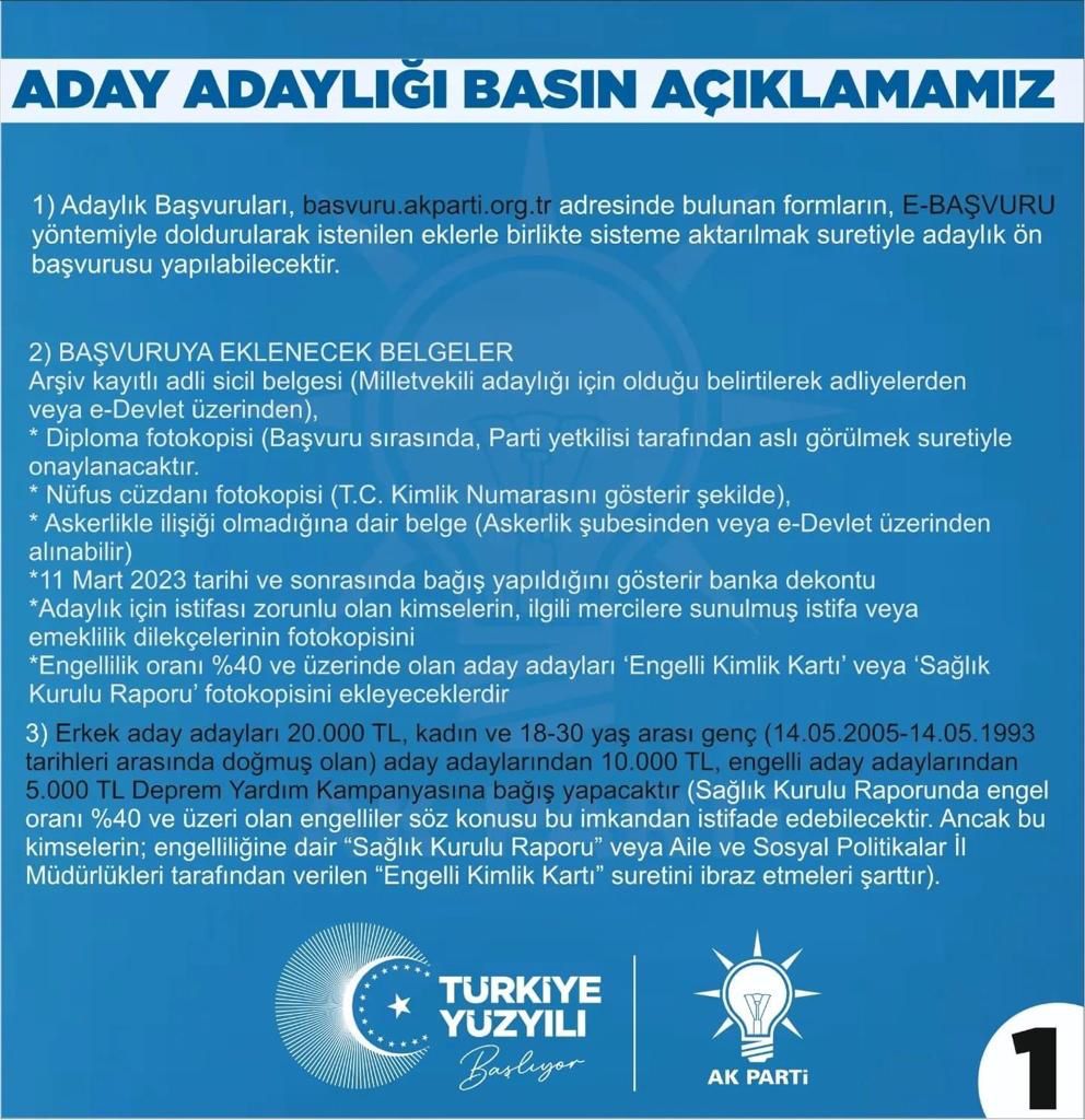 Başvuruların 16 Mart Perşembe günü saat 21.00’a kadar devam edeceğini belirten Abidin Çağlayan “28. dönem milletvekili aday adaylarımız başvurularını il başkanlığı binamız, genel merkezimiz ya da basvuru.akparti.org.tr adresi üzerinden yapabilirler. Adaylık başvurusu için; erkek adayların 20 bin lira, kadın ve genç adayların 10 bin lira, engelli adayların ise 5 bin liralık tutarı AFAD’ın deprem yardım hesaplarına isim soy isim, T.C. kimlik numarası ve doğum tarihini belirterek bağış olarak yatırması gerekiyor. Sistem üzerinden başvuru yapan aday adaylarımızın başvuru esnasında gerekli belgeleri alındı belgeleri ile birlikte il başkanlığımıza getirmeleri gerekmektedir” dedi.