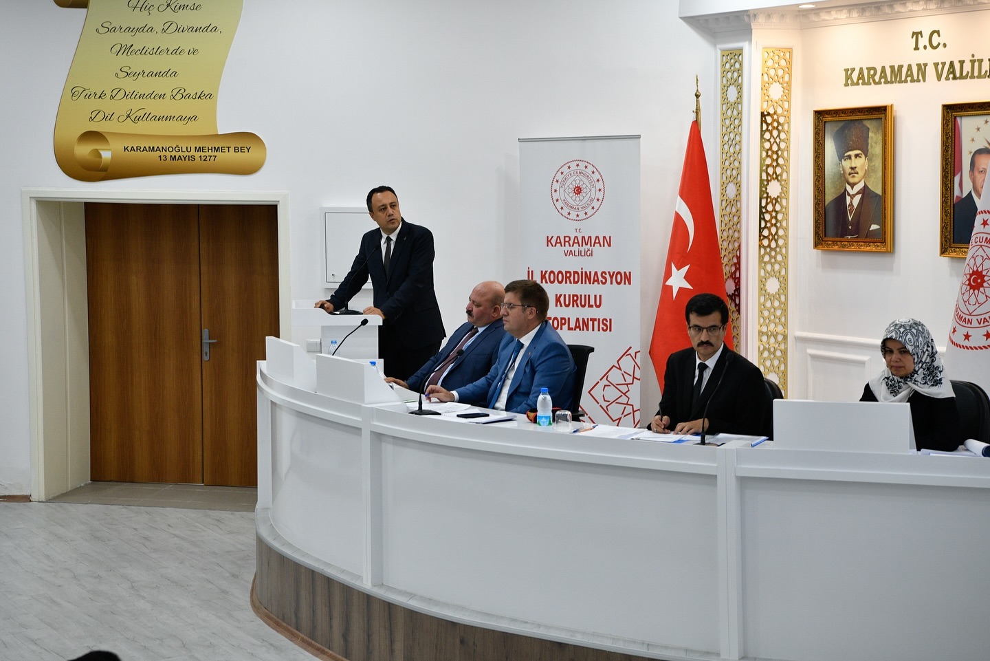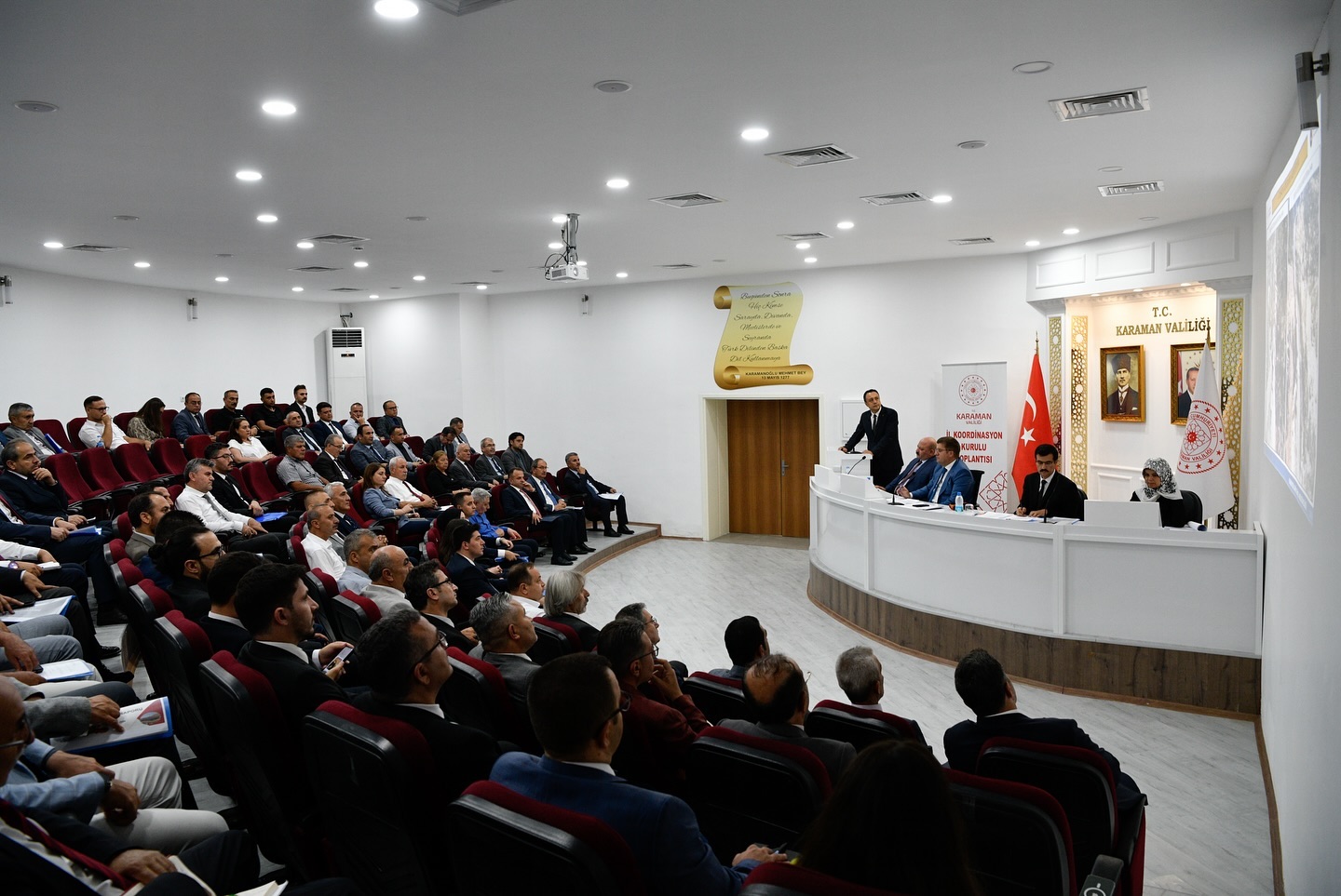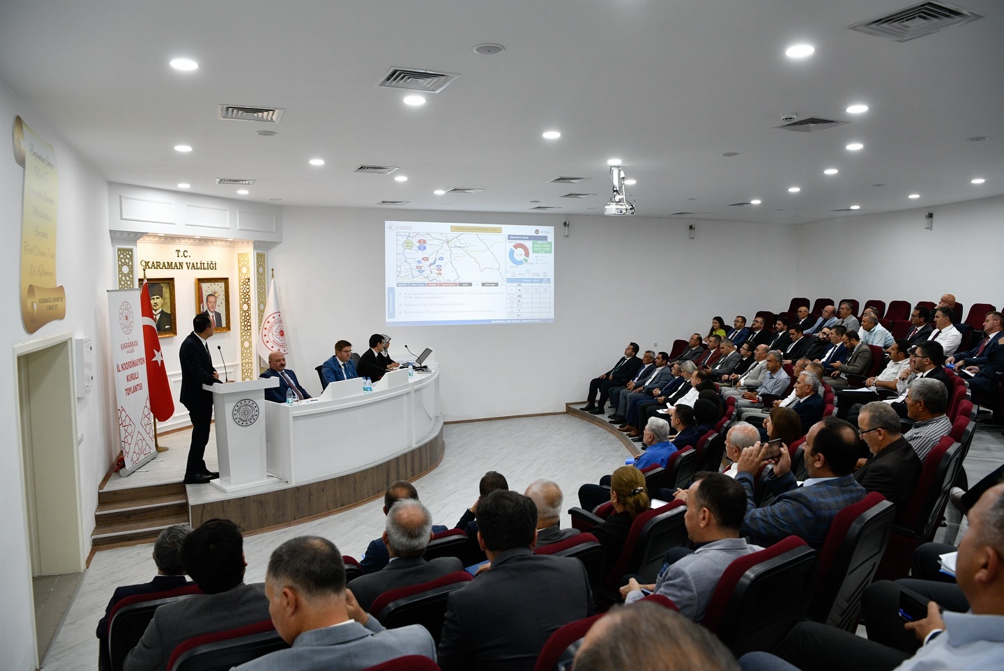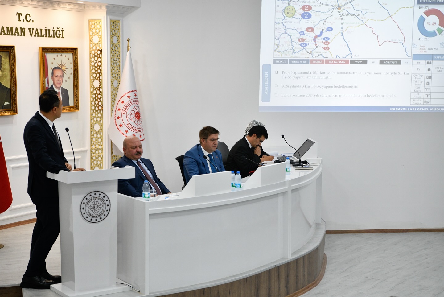 Kamu yatırımlarının il düzeyinde uygulanması, izlenmesi ve koordinasyonun sağlanması amacıyla düzenlenen 2024 yılının 3. İl Koordinasyon Kurulu Toplantısı, Vali H. Engin Sarıibrahim başkanlığında gerçekleştirildi.Karamanoğlu Mehmet Bey Toplantı salonunda yatırımcı kuruluşların temsilcilerinin katılımıyla gerçekleştirilen toplantının ilimiz için hayırlı olması dileklerinde bulunan Valimiz H.Engin Sarıibrahim, 2024’te 143 proje üzerinde çalışıldığını, 42 tanesinin tamamlandığını diğer projelerin ise devam ettiğini belirtti.Konuşmasının devamında 143 projenin toplam tutarının 28.2 milyar lira olduğunu belirten Valimiz H.Engin Sarıibrahim, “143 Projenin 57’si Bölge Müdürlüklerine, 36’sı İl Özel İdaresine, 24’ü İl Müdürlüklerine, 22’si belediyelere, 1’i Toplu Konut İdaresine ve 3’ü (İl Özel İdaresi İşbirliğinde) KOP idaresine aittir.” ifadelerini kullandı.Valimiz H. Engin Sarıibrahim’in konuşmasının ardından söz alan yatırımcı kuruluşların bölge temsilcileri ve kurum amirleri, 30 Haziran 2024 tarihi itibariyle il genelinde yatırımların gerçekleşme durumu ve devam eden projeler hakkında koordinasyon kurulu üyelerine bilgiler verdiler.