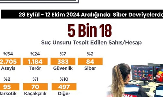 İçişleri Bakanı Ali Yerlikaya, "siber devriyelerimiz, sanal dünyada da suçluların peşinde" açıklamasını yaparak siber suçlarla mücadeleye ilişkin açıklalarda bulundu. 28 Eylül-12 Ekim 2024 tarihleri arasında Siber Devriyelerimiz 5 bin 18 sosyal medya hesabındaki paylaşımlarda suç unsuru tespit etti. Bu hesapların paylaşımlarının;
