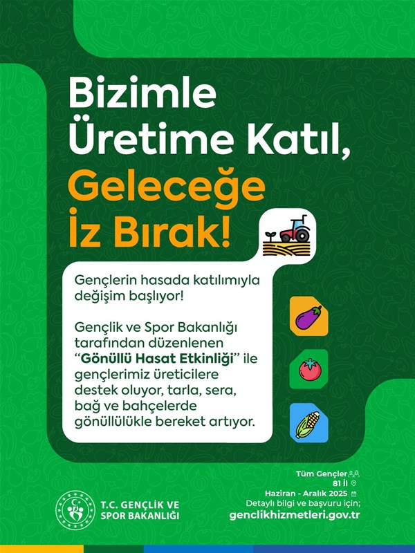 Gençlik ve Spor Bakanlığı’nın Gençlik Hizmetleri Genel Müdürlüğü koordinesinde 81 ilde hayata geçirilen proje ile gençler, çiftçilere destek sağlarken, aynı zamanda üretim bilinci, çevre farkındalığı ve emek anlayışı kazanacak. Etkinlikler, Gençlik ve Spor İl Müdürlüklerinin yönetiminde, muhtarlıklar ve yerel çiftçilerle iş birliği içinde yürütülecek.