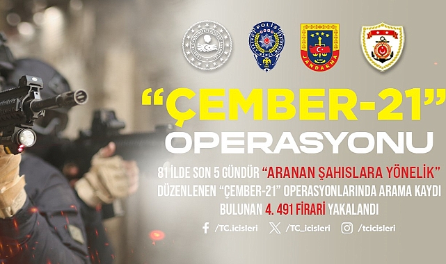 Ali Yerlikaya; Firari Suçlular İçin Çember Daralmaya Devam Ediyor! 81 ilde son 5 gündür “Aranan Şahıslara Yönelik” düzenlenen “ÇEMBER-21” operasyonlarında arama kaydı bulunan 4.491 firari yakalandığını açıkladı. Aziz Milletimizin Bilmesini İsterim ki; Firari suçluların sokaklarımızda gezmelerine asla izin vermeyeceğiz. Ailelerimizin huzurunu kaçırmalarına müsaade etmedik, etmeyeceğiz! '' ifadelerinde bulunan Bakanımız Sayın Ali Yerlikaya sosyal medya hesabından yaptığı paylaşımda ayrıca şu ifadelere yer verdi;Yakalanan şahısların kaç yıldır arandığı: