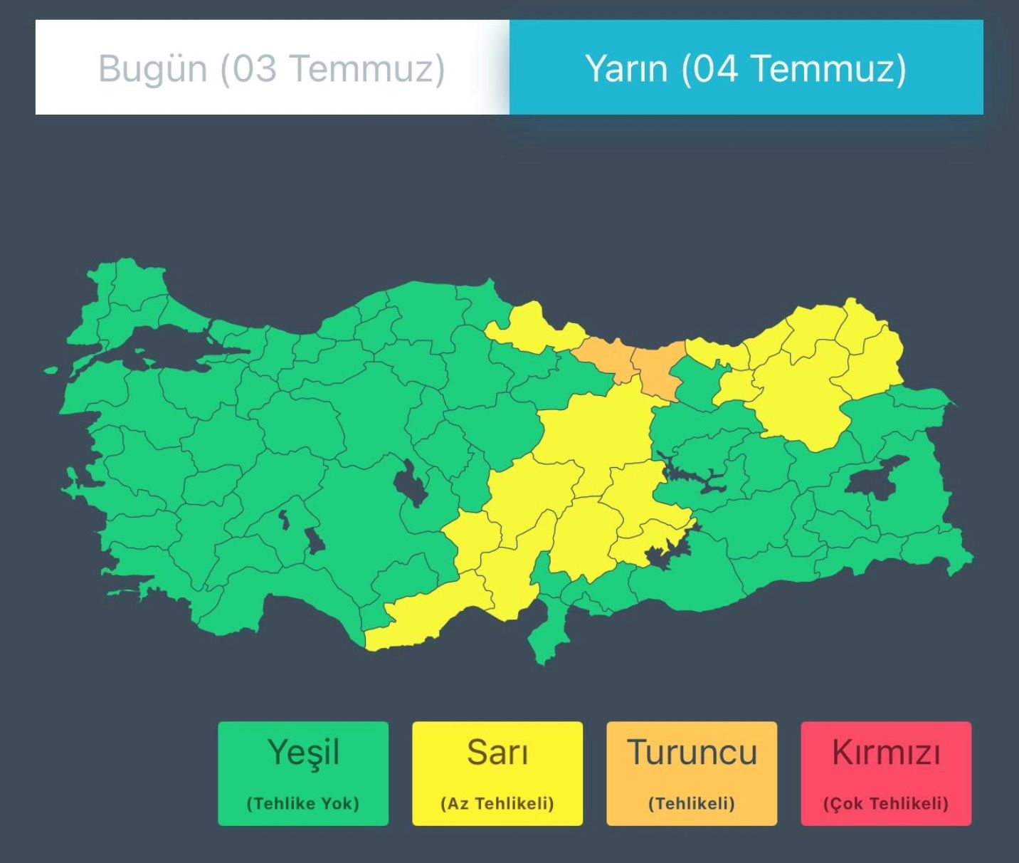 Meteoroloji Genel Müdürlüğü’nden alınan son değerlendirmelere göre; ülkemizin çeşitli bölgelerinde etkili olması beklenen kuvvetli rüzgar ve gök gürültülü sağanak yağışlar nedeniyle 03-04 Temmuz 2025 tarihlerinde çok sayıda il için meteorolojik uyarı yapıldı.
