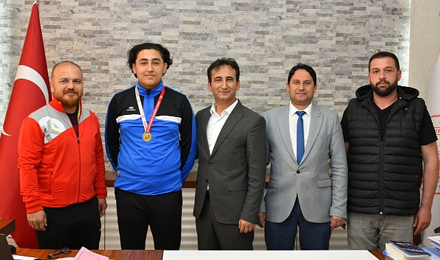Türkiye şampiyonu İbrahim Sağlamçelik, Okul Müdürü Hüseyin Yılmaz, Judo Antrenörü Ahmet Ömre Türe ve velisi Soner Sağlamçelik ile birlikte İl Millî Eğitim Müdürü Mehmet Çalışkan'ı ziyaret etti.