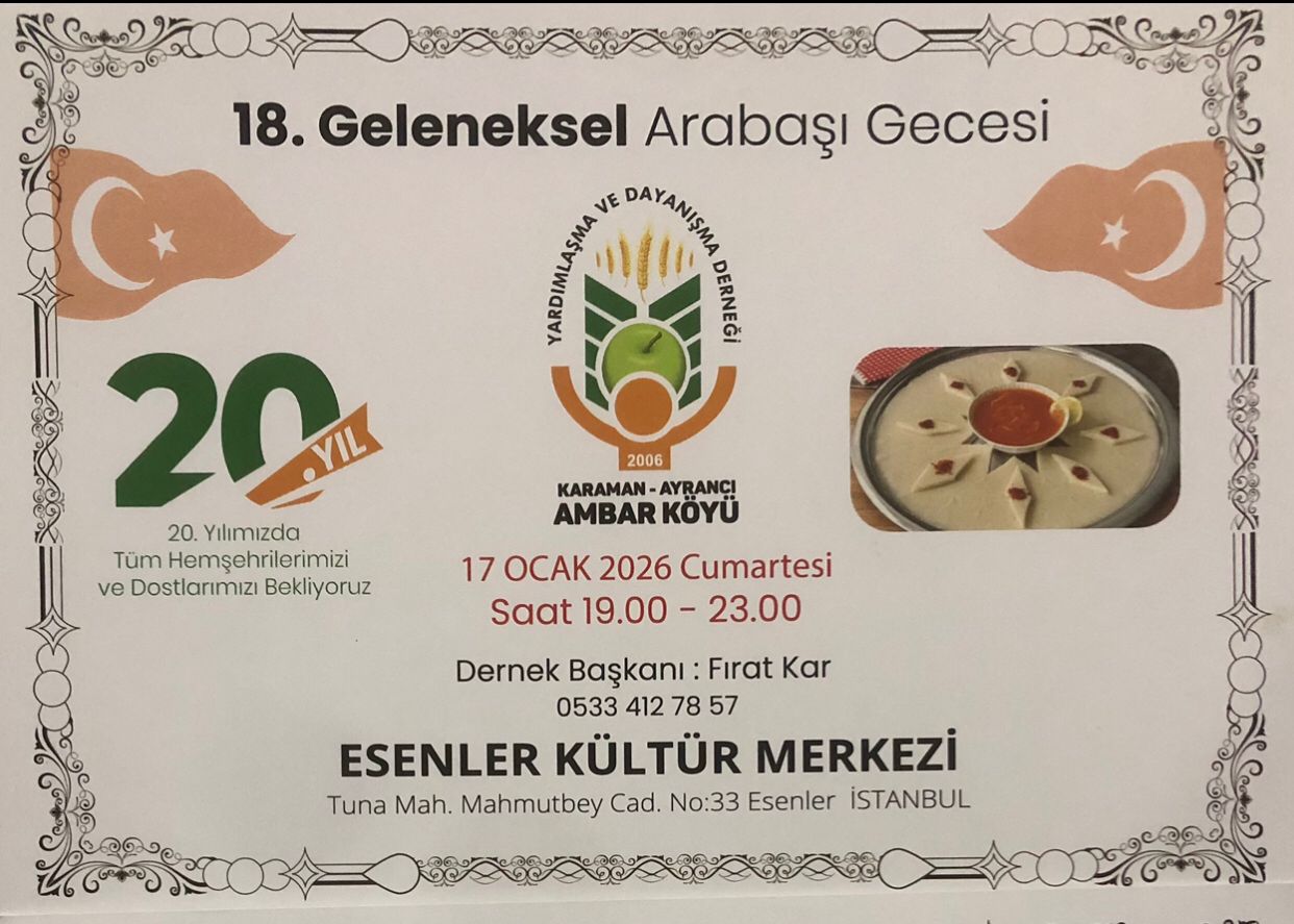 Karaman’ın Ayrancı ilçesine bağlı Ambar Köyü Derneği tarafından 20. kuruluş yılına özel olarak düzenlenen 18. Geleneksel Arabaşı Gecesi, 17 Ocak 2026 Cumartesi günü İstanbul Esenler Kültür Merkezi’nde yoğun katılımla gerçekleştirildi. Saat 19.00’da başlayan program, hem geleneksel kültürün yaşatıldığı hem de katılımcılara unutulmaz anların sunulduğu anlamlı bir geceye sahne oldu.