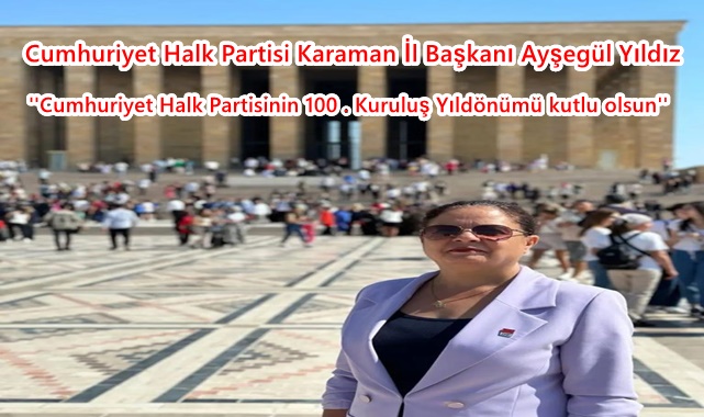 Cumhuriyet Halk Partisi Karaman İl Başkanı Ayşegül Yıldız Cumhuriyet Halk Partisinin 100. Kuruluş Yıldönümü Kutladı.Cumhuriyet Halk Partisi Karaman İl Başkanı Ayşegül Yıldız: ''Demokrasi, özgürlük ve bağımsızlığımızın garantisi, kimsesizlerin kimsesi Cumhuriyetimizin kurucu partisi Cumhuriyet Halk Partisinin 100 .Kuruluş Yıldönümü kutlu olsun.'' ifadelerini kullandı.