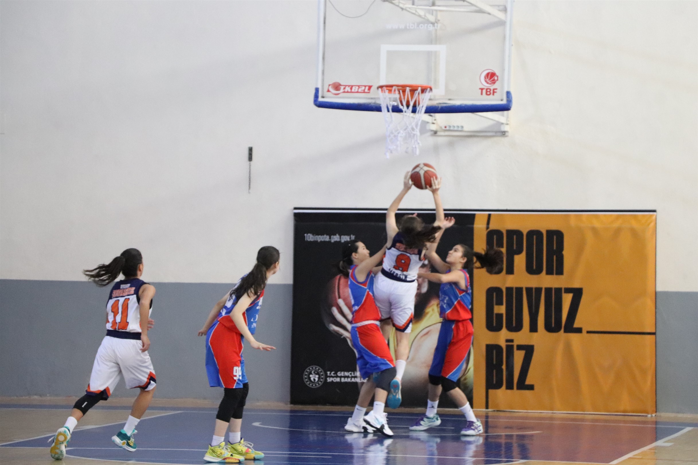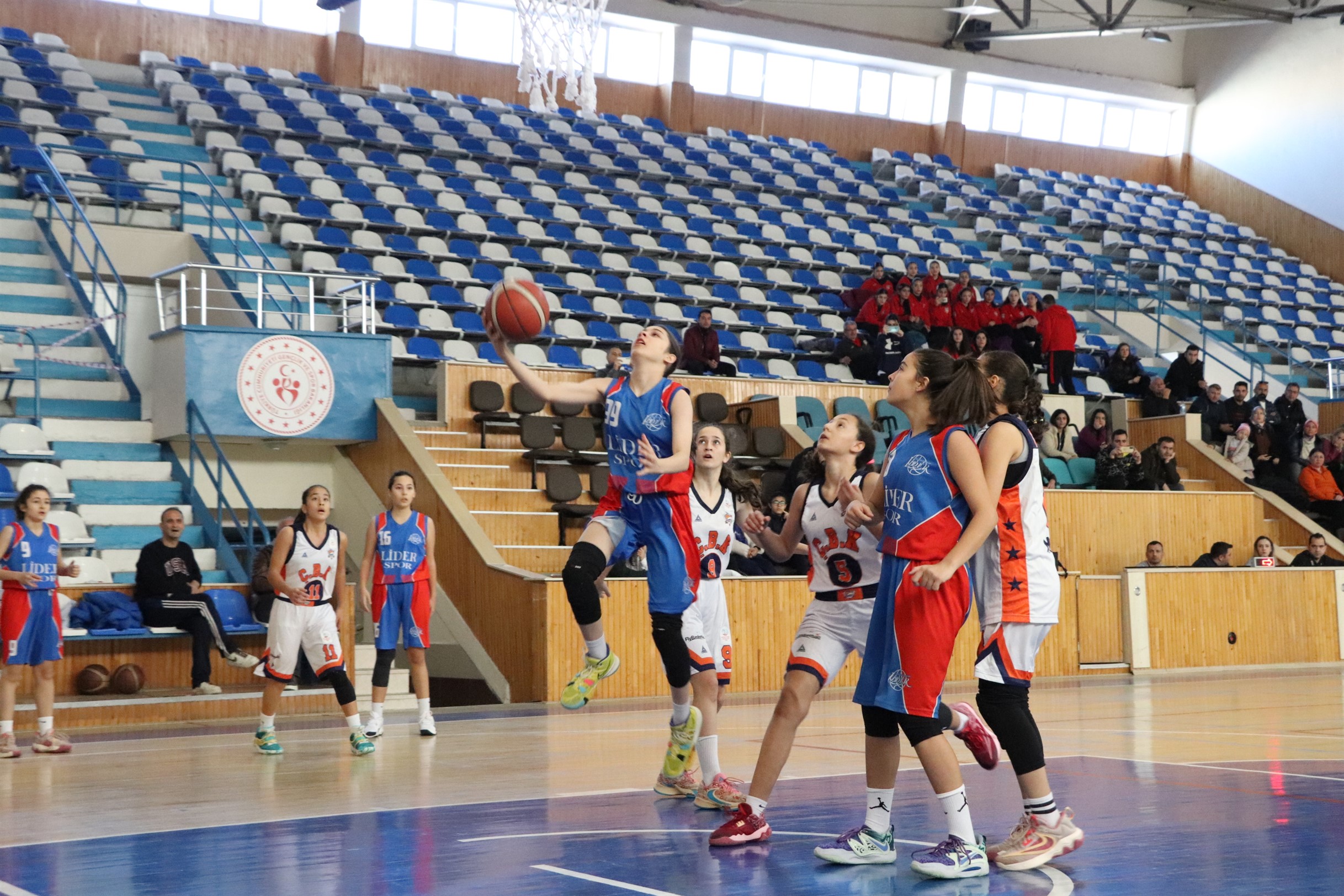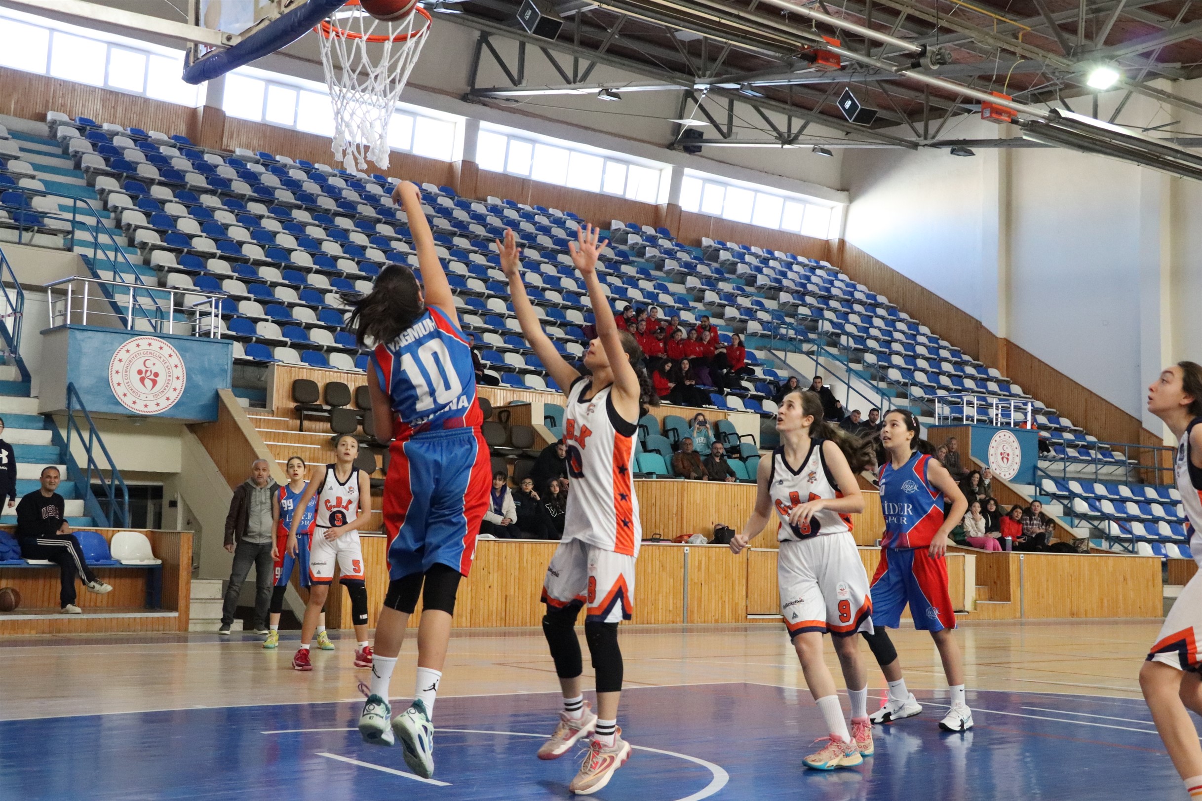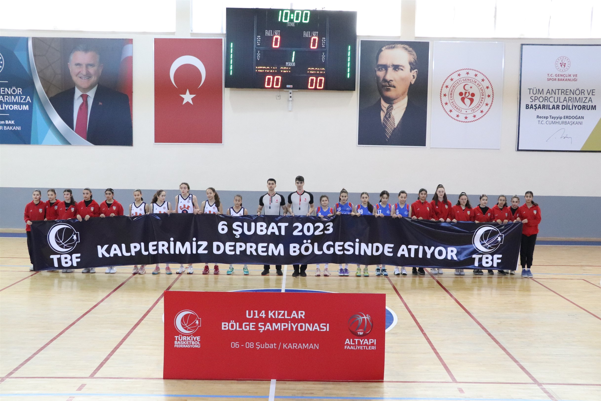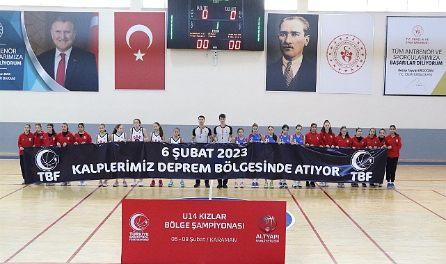Karaman Gençlik ve Spor İl Müdürlüğü’nün ev sahipliğinde düzenlenen U14 Kızlar Basketbol Bölge Şampiyonasında sporcular maçlara “Kalplerimiz Deprem Bölgesinde Atıyor” pankartıyla çıktı.