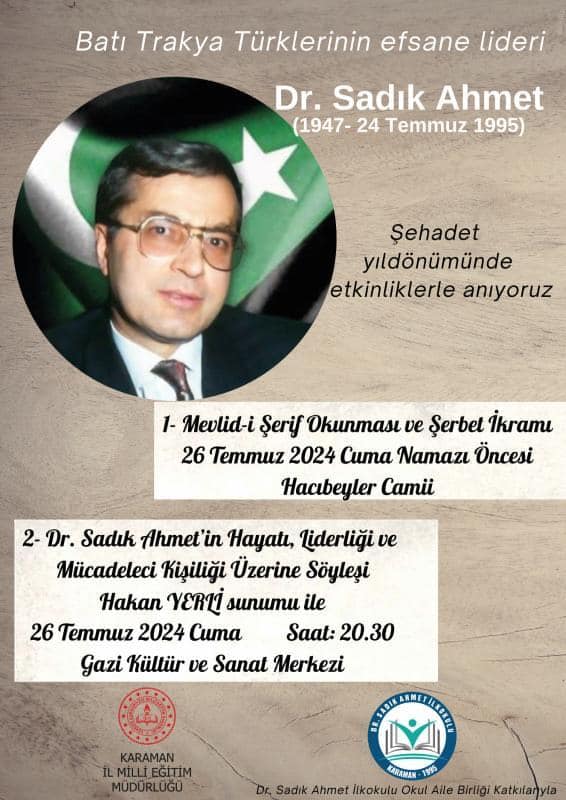 Batı Trakya Türklerinin efsane lideri Dr. Sadık Ahmet ölumünün 29. yıl dönümünde Karaman'da isminin verildiği okulun organizesiyle dualar ve etkinliklerle anıldı.