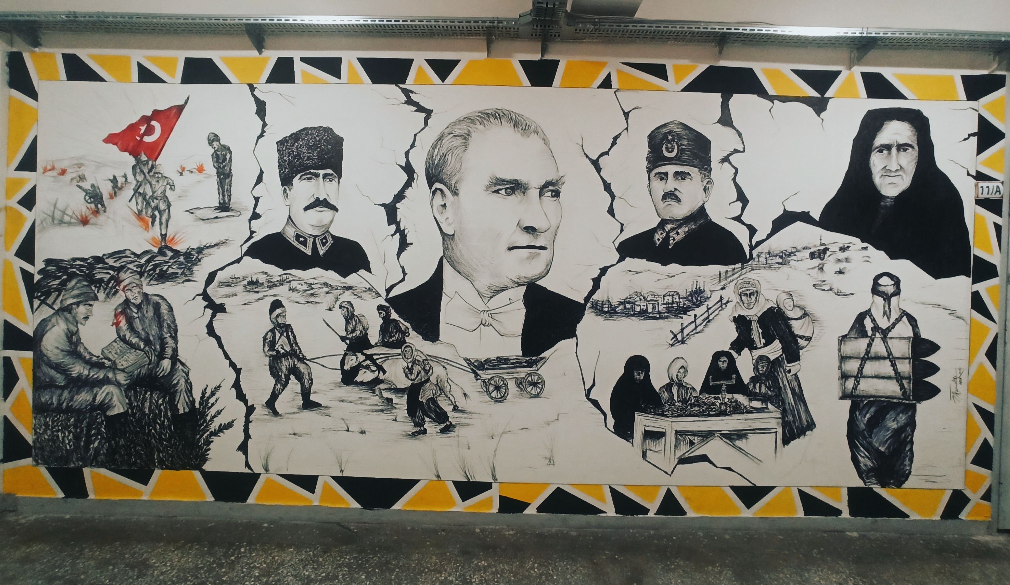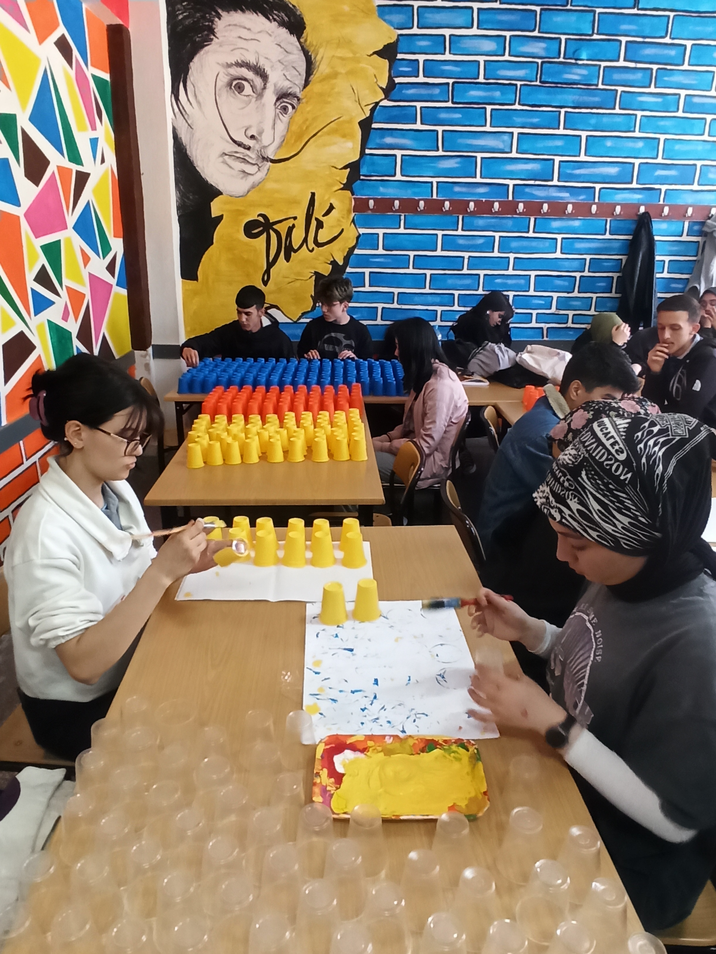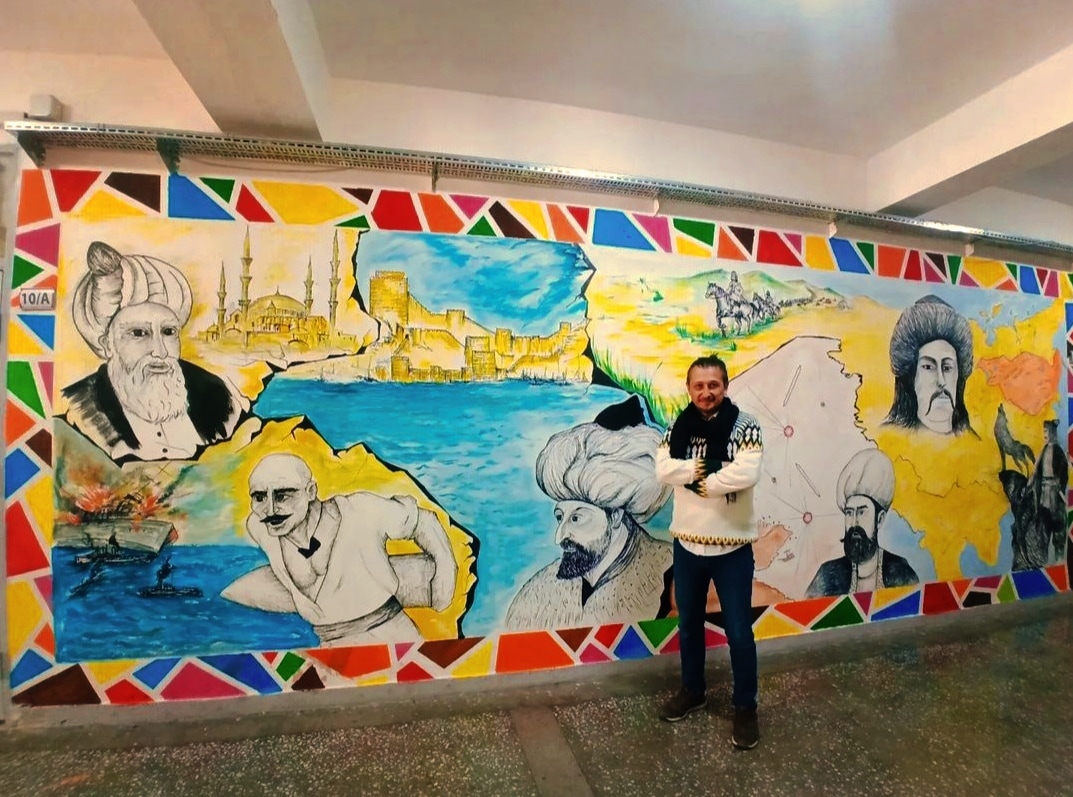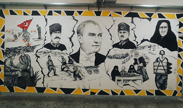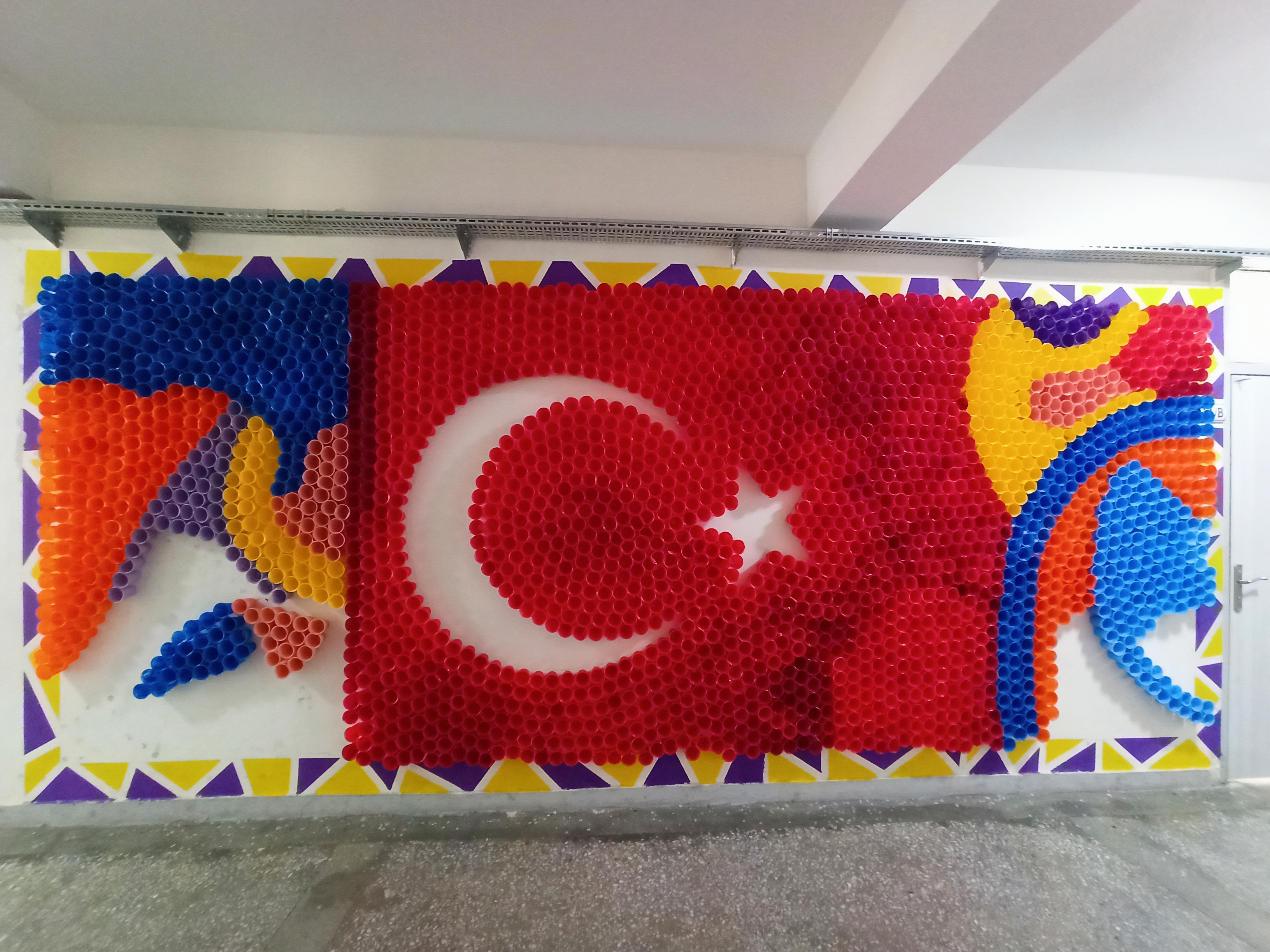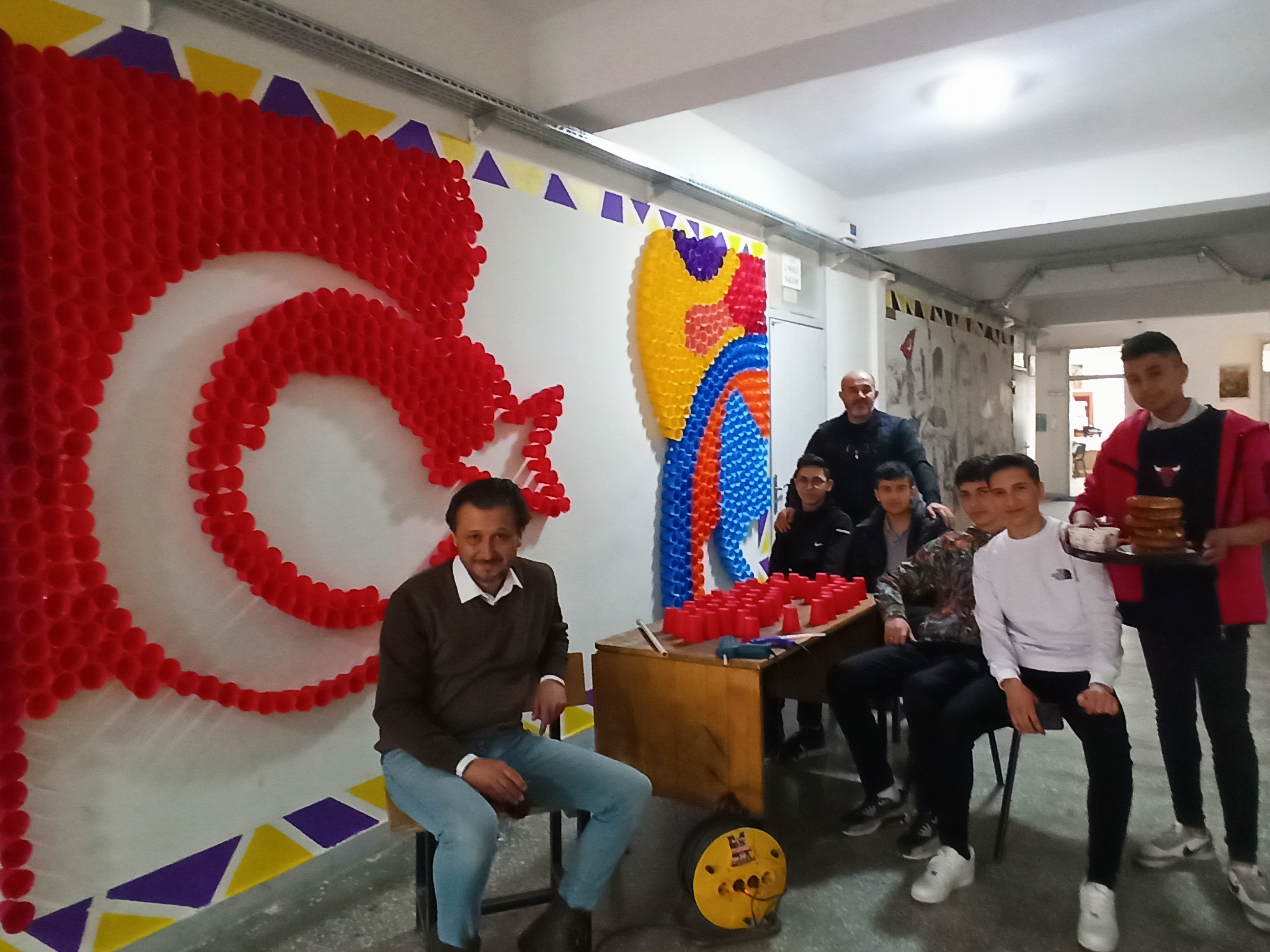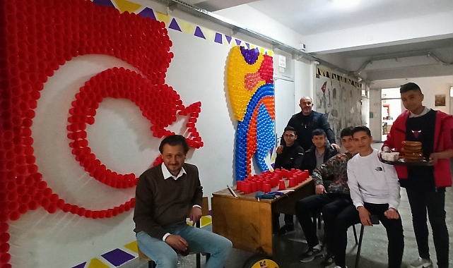 Okulun Görsel Sanatlar Öğretmeni İlker Sarı yönetimin de çalışan öğrenciler kuruluşumuzun 100. yılına ithafen 2023 adet atık pet bardakla 245x680 cm ölçülerinde duvar üzerine çalışma yaptılar. Çalışma ile bilgi veren Görsel Sanatlar Öğretmeni İlker Sarı; " Ana malzemesi Atık pet bardaklardan oluşan bu çalışma da bağrında birçok etnik grubun yaşadığı aziz vatanımızı renklerle ifade ederek ortak paydamız kutsal bayrağımız ile taçlandırdık.. Farklı renkler vatanımızda yaşayan çeşitli etnik vatandaşlarımızı temsil ediyor ve ortada Türk bayrağı altında TÜRK MİLLETİ olarak buluşuyor. Ara boşluklar ise ülkemize gelen dış tehditleri sembolize etmektedir." dedi.