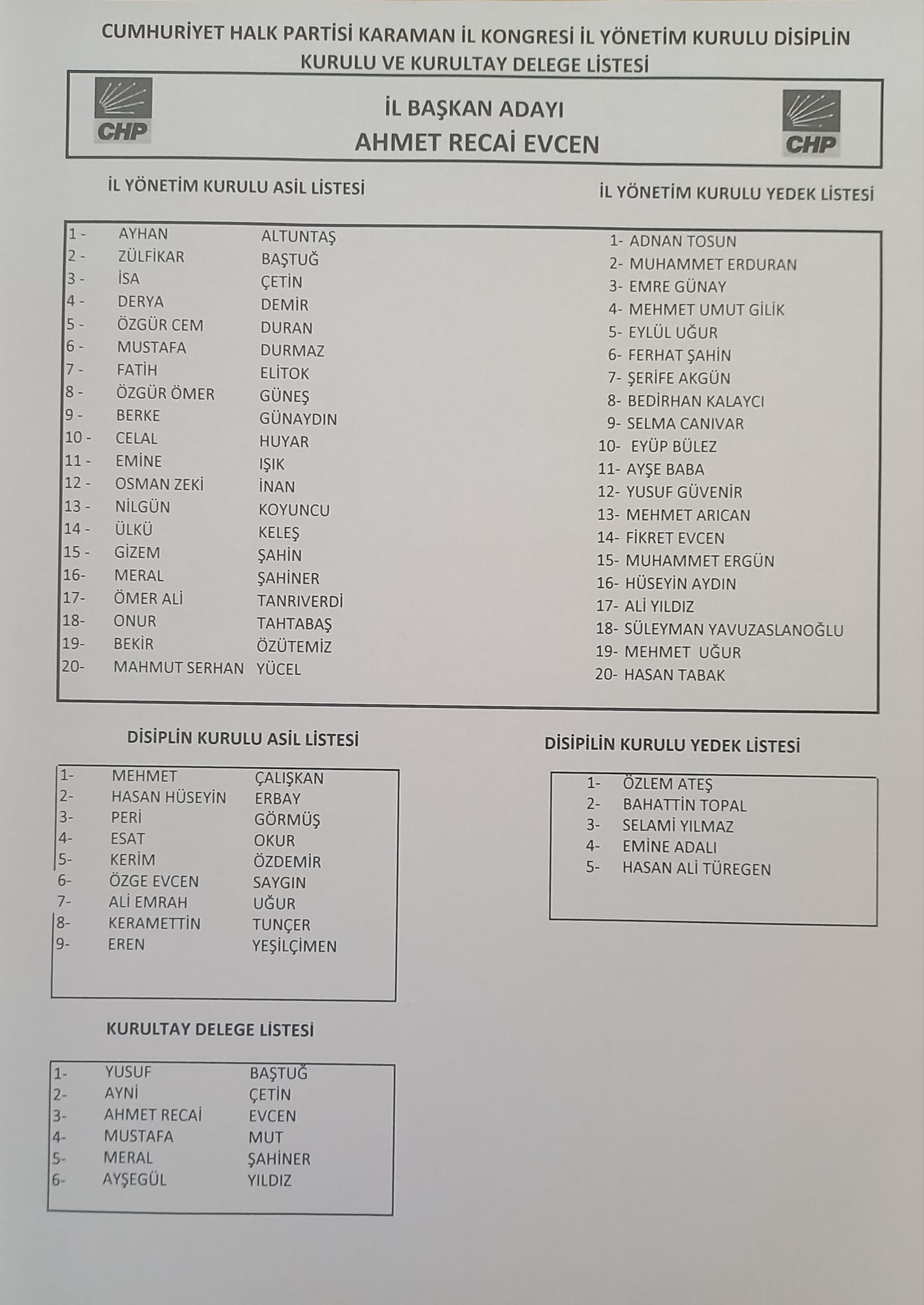 17 Eylül 2023 Pazar saat 11.00'da yapılan Cumhuriyet Halk Partisi Karaman Olağan İl Kongresinde CHP Karaman İl Başkanı Ahmet Recai Evcen Oldu.Divan Başkanlığı CHP Genel Başkan Yardımcısı ve Parti Sözcüsü Faik Öztrak'ın yaptığı Olağan İl Kongresi gerçekleştirildi.Ahmet Recai Evcen' in tek liste olarak girmiş olduğu Olağan İl Kongremizde İl Başkanı olarak seçildi.KaramanHaberAl Ailesi olarak Ahmet Recai Evcen'e başarılar dileriz.
