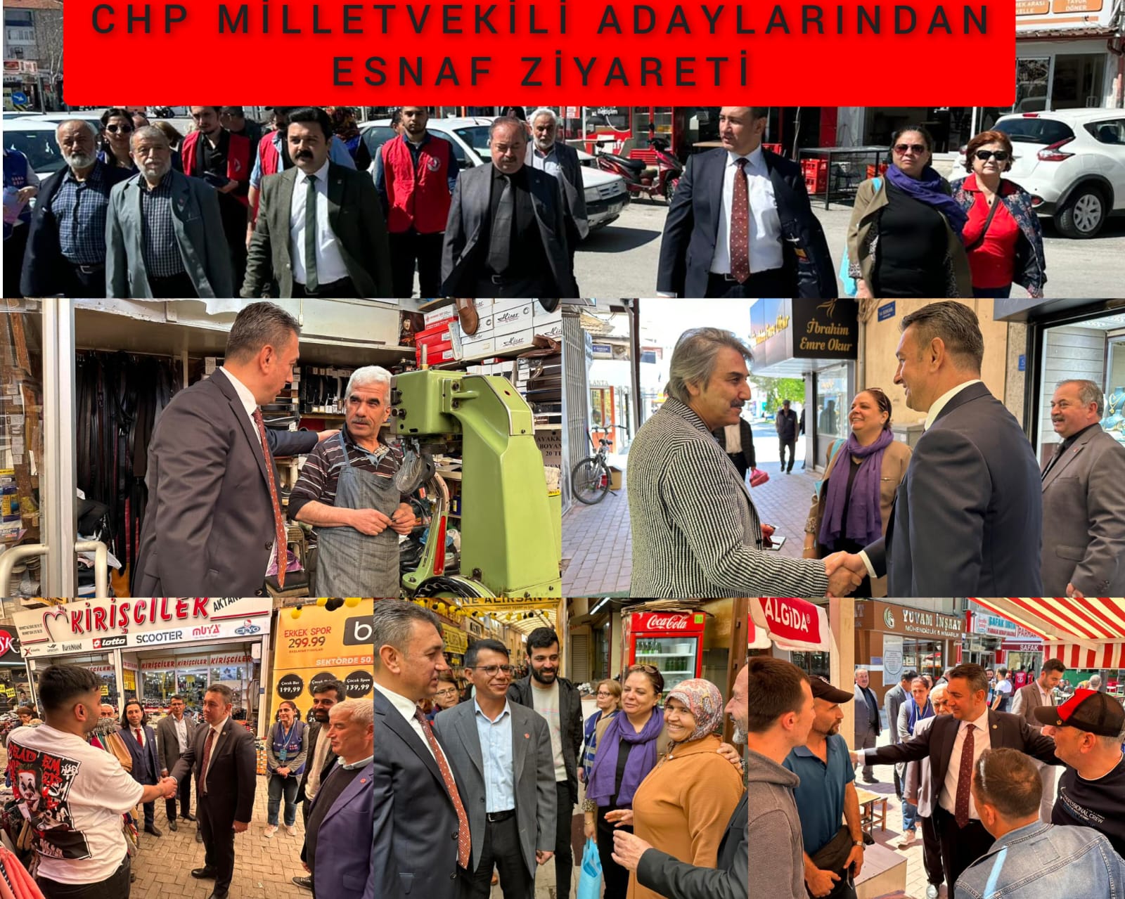 CHP Milletvekili Adayları Av. İsmail Atakan Ünver, Yusuf Baştuğ ve Hasan Ehliz, İl Başkanı Ayşegül Yıldız, Merkez İlçe Başkanı Ahmet Recai Evcen, Belediye Meclis Üyesi Paşa Evcen, parti yöneticileri, Millet İttifakı ortakları Deva Partisi İl Başkanı Mustafa Burak Demirer ve yöneticileri, Saadet Partisi yöneticileri ile birlikte çarşı esnafını ziyaret ederek sorunlarını dinledi, Millet İttifakı iktidarında yapılacak olan çalışmaları anlattı.