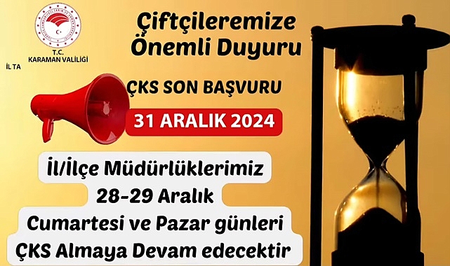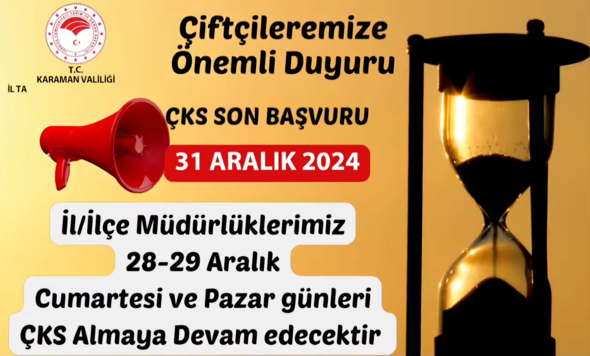 Karaman İl Tarım ve Orman Müdürlüğü Uyardı, Çiftçi Kayıt Sistemi başvuruları 31 Aralık 2024 tarihinde sona erecek.Karaman İl Tarım ve Orman Müdürlüğü:''İL/İLÇE MÜDÜRLÜKLERİMİZ HAFTA SONU AÇIK.