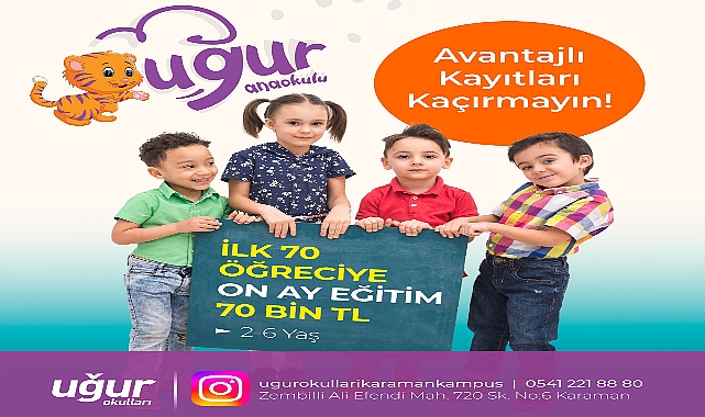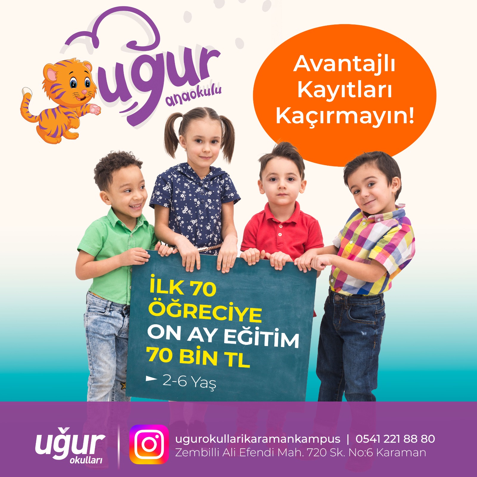 Karaman’ın tek global markalı ana okulu Uğur, 25 Mayıs tarihine kadar kayıt oluşturan velilere yılın fırsatını sunuyor.