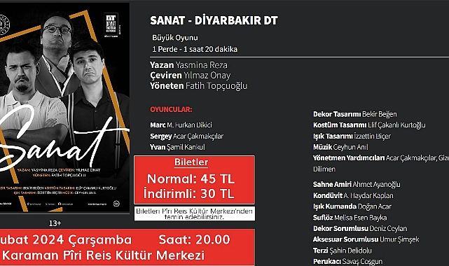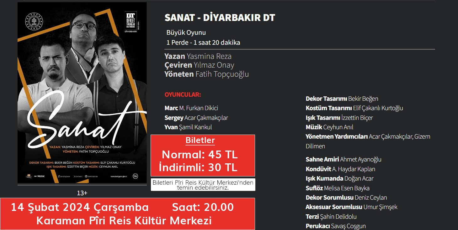 Karaman İl Kültür ve Turizm Müdürlüğü tarafından son dönemde düzenlenen kültür-sanat etkinlikleri sayesinde vatandaşların uğrak yeri haline gelen Pîri Reis Kültür Merkezi bu kez de Diyarbakır Devlet Tiyatroları’na ev sahipliği yapmaya hazırlanıyor. Üç arkadaşın boş, beyaz bir tablo üzerinden arkadaşlıklarını masaya yatırmalarını ele alan “Sanat” isimli tiyatro oyunu 14 Şubat 2024 Çarşamba Saat: 20.00’da sanatseverlerle buluşacak. Tiyatro oyununu izlemek isteyen vatandaşlar biletlerini (normal 45 TL, indirimli 30 TL) Pîri Reis Kültür Merkezi’nden temin edebilecekler.