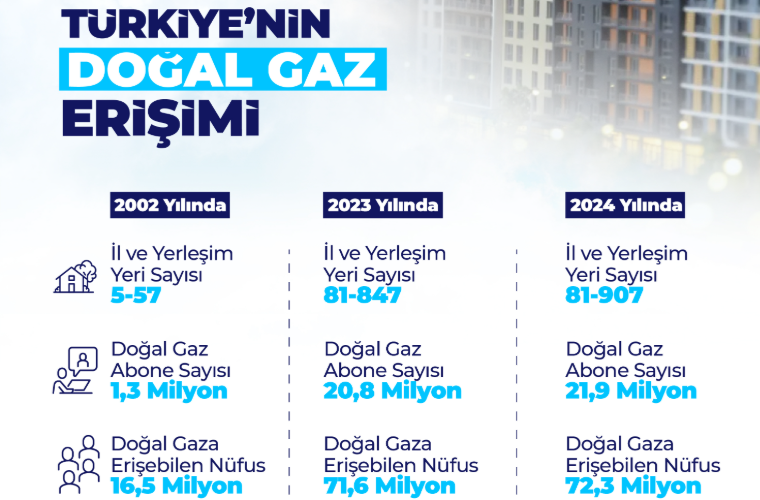 Doğal gaz ulaşan yerleşim yeri sayısı 913’e ulaştı. Enerji ve Tabii Kaynaklar Bakanı Alparslan Bayraktar, doğal gaz ağlarıyla Türkiye nüfusunun yüzde 85’ine ulaştıklarını belirterek “Artık köylerden bile doğal gaz talepleri gelmeye başladı. 2026 sonu itibarıyla toplam bin 53 yerleşim yerine doğal gazı götürmüş olacağız.” dedi.