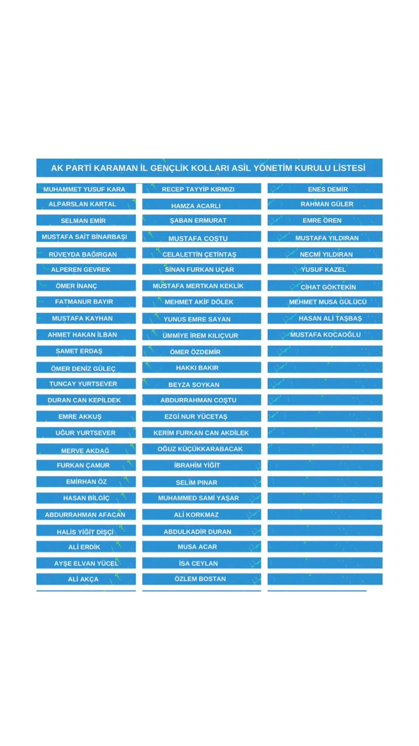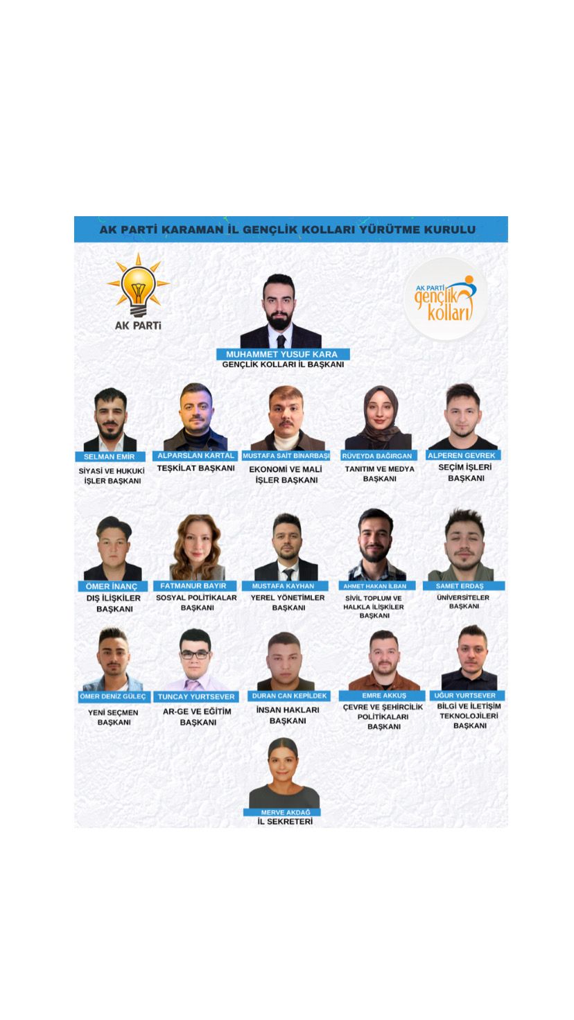 Gençlik Kolları A Takımı Belli Oldu.AK Parti Karaman İl Gençlik Kolları Yeni Yürütme ve Yönetim Kurulu Belli Oldu.AK Parti Karaman İl Gençlik Kolları Resmi Sayfası:''AK Parti Karaman İl Gençlik Kolları Yeni Yürütme ve Yönetim Kurulu Üyelerimiz Partimize ve İlimize Hayırlı Olsun.Görevi devreden dava arkadaşlarımıza emeklerinden dolayı teşekkür ediyor, yeni dönemde görev alan Yürütme ve Yönetim Kurulu Üyelerimize muvaffakiyetler diliyoruz .Karaman gençliğine hayırlı olsun.'' ifadeleri kullanıldı.