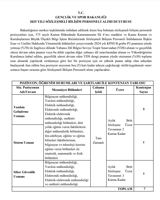 GENÇLİK VE SPOR BAKANLIĞI PERSONELİ ALIMINDA BULUNCAKGençlik ve Spor Bakanlığı merkez teşkilatında istihdam edilmek üzere Sözleşmeli Bilişim Personeli AlacakGençlik ve Spor Bakanlığı merkez teşkilatında istihdam edilmek üzere boş bulunan sözleşmeli bilişim personeli pozisyonları için, 375 sayılı Kanun Hükmünde Kararnamenin Ek 6’ncı maddesi ve Kamu Kurum ve Kuruluşlarının Büyük Ölçekli Bilgi İşlem Birimlerinde Sözleşmeli Bilişim Personeli İstihdamına İlişkin Esas ve Usuller Hakkında Yönetmelik hükümleri çerçevesinde 2024 yılı KPSS B grubu P3 puanının yüzde yetmişi (%70) ile İngilizce dilinde Yabancı Dil Bilgisi Seviye Tespit Sınavından (YDS) alınan ve geçerlilik süresi devam eden puanın veya bu dilde yapılan diğer yabancı dil sınavlarından alınan ve Yükseköğretim Kurulunca kabul edilen, geçerlilik süresi devam eden YDS dengi puanın yüzde otuzunun (%30) toplamı esas alınarak yapılacak sıralamaya göre her bir pozisyon için en yüksek puana sahip olan adaydan başlayarak ilan edilen boş pozisyon sayısının beş (5) katı kadar adayın çağrılacağı sözlü/uygulamalı sınav sonucu başarı sırasına göre Sözleşmeli Bilişim Personeli alımı yapılacaktır.