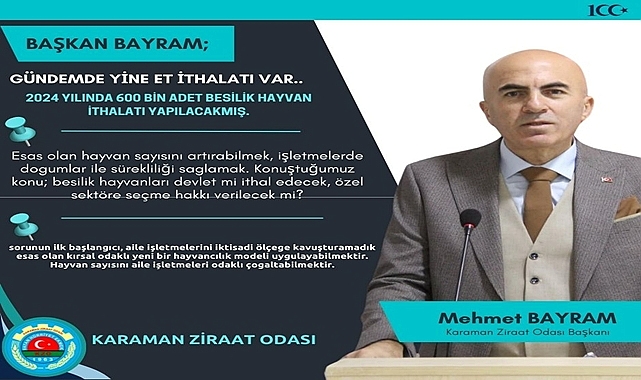 Karaman Ziraat Odası Başkanı Mehmet Bayram: 2024 yılında 600 bin adet besilik hayvan ithalatı yapılacakmış. Besilik hayvan, belirli yaş aralıgında ithal edilip yurtiçinde ortalama bir yıl beslenerek et ihtiyacı için kesilen hayvanlar.