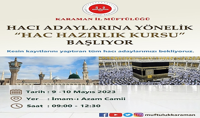 Karaman Müftülüğü tarafından; 2023 yılında hacca gidecek vatandaşlar için, 09 ve 10 Mayıs 2023 tarihlerinde, 09:00-12:30 saatleri arasında İmam-ı Azam Camii'nde “Hac Hazırlık Seminerleri” düzenlenecektir.