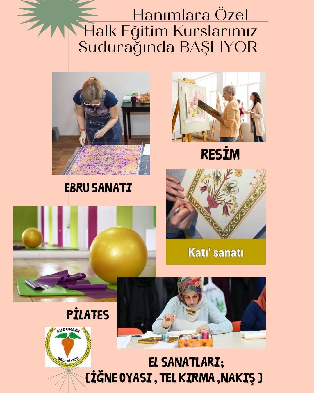 Sudurağı Belediyesi Halk Eğitim aracılığıyla Hanımlar için 3 ayrı kurs açılacağını duyurdu.''Kasabamızda Halk Eğitim aracılığıyla Hanımlar için 3 ayrı kurs açılacaktır.Açılabilecek kurs dalları aşağıya yazılmıştır.Kursa katılmak isteyen hanımların0338 233 20 03 numaralı telefonu arayarakKatılmak istediği kurs dalını ve ismini yazdırması gerekmektedir. Toplanan taleplere göre talebin yüksek olduğu kurs belirlenecek ve açılacaktır.1. Plates ( Kesin açılacaktır) 2. Resim 3. Kat'ı sanati 4. El Sanatları ( İğne oyası- Tel kırma- Nakış) 5. Ebru sanatı'' ifadelerini kullandı.