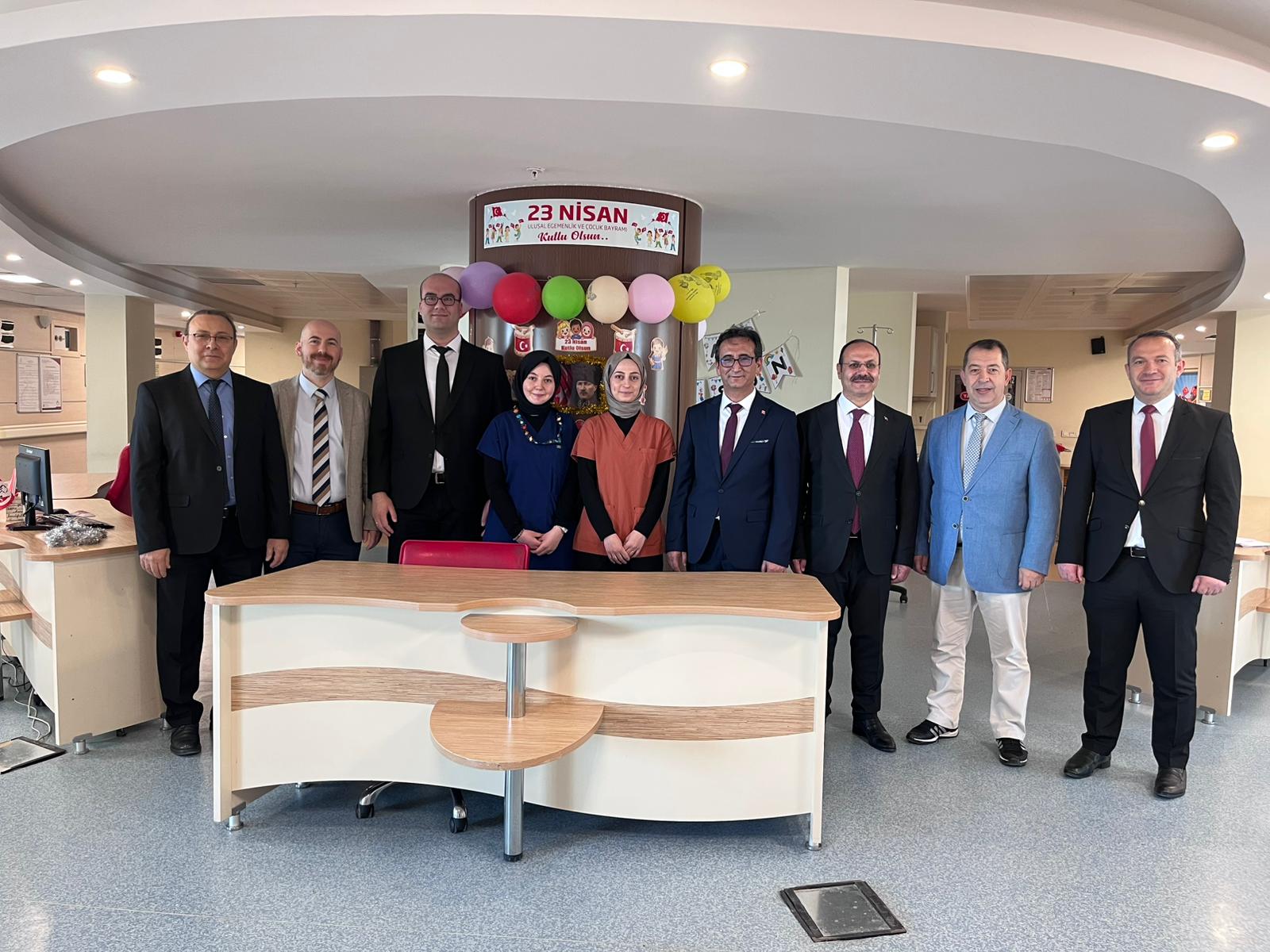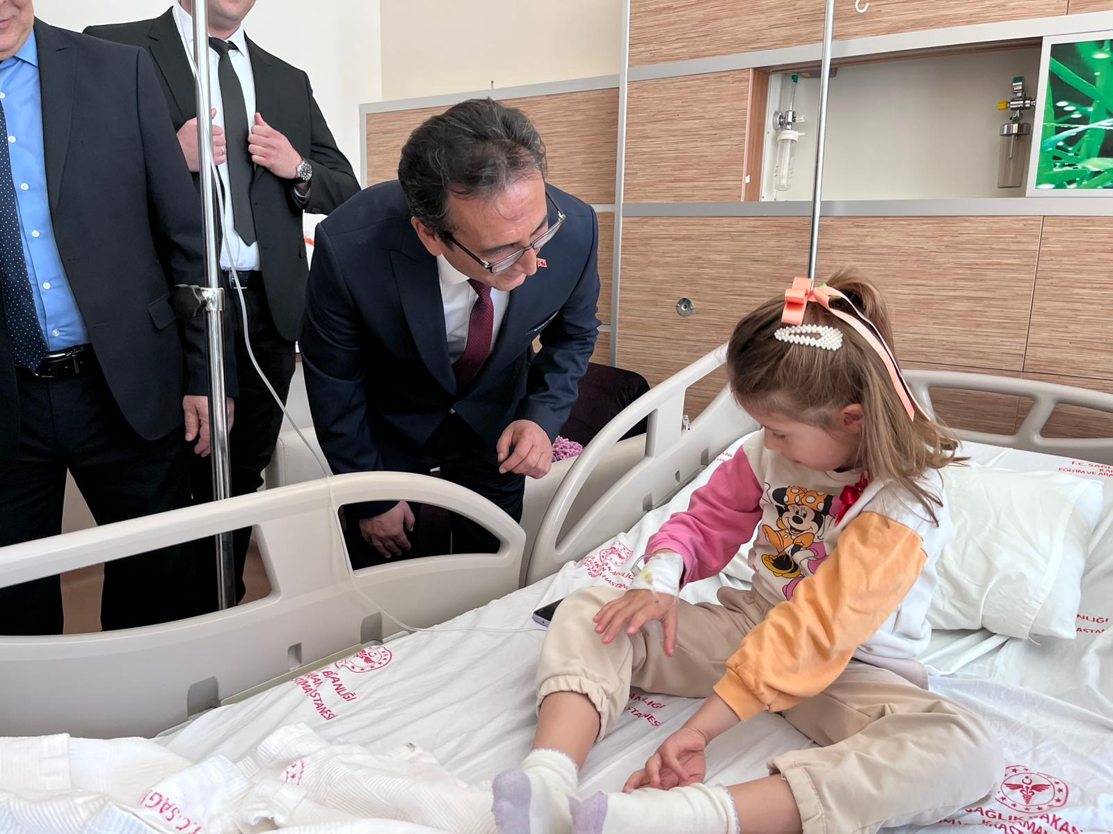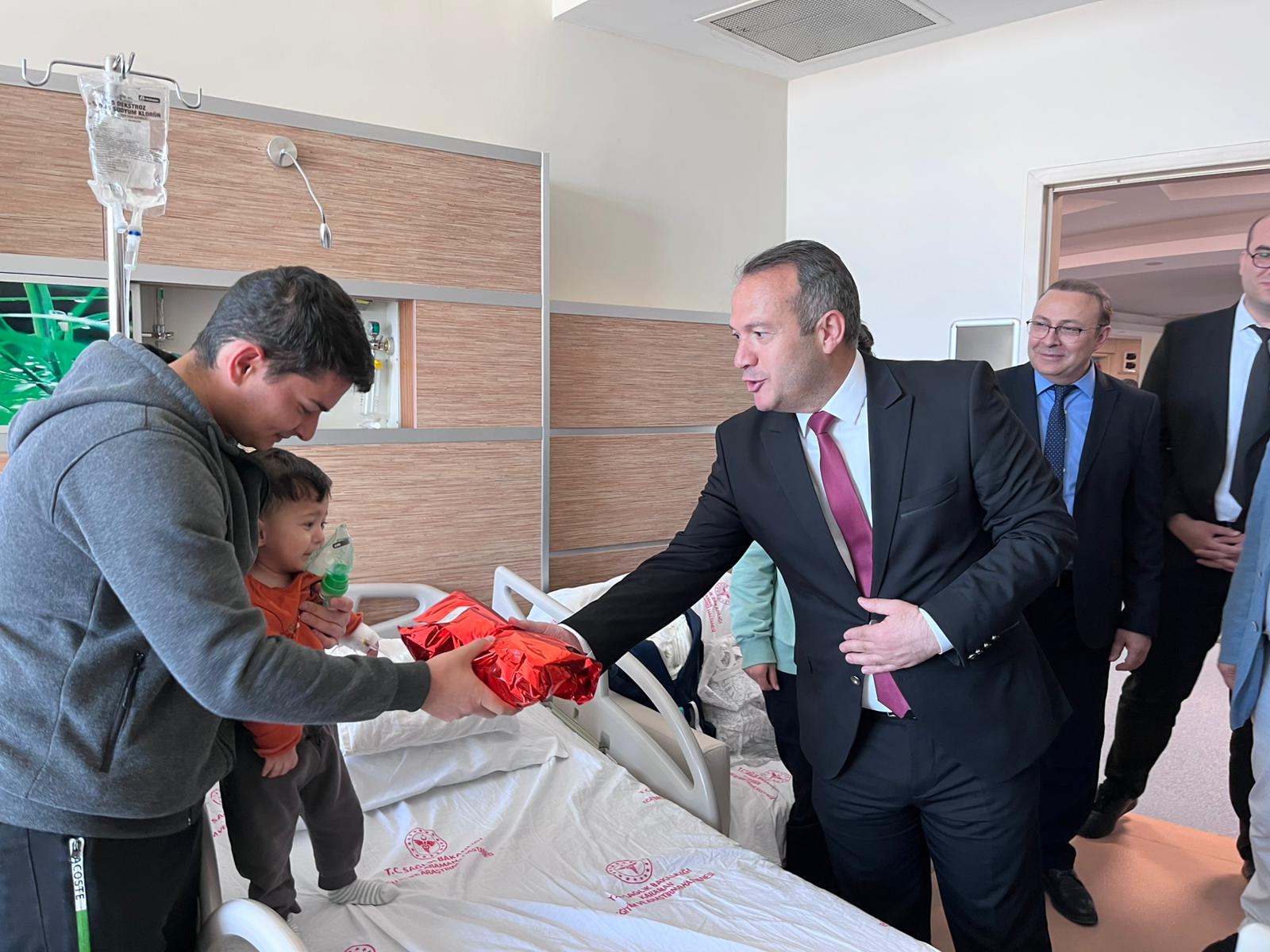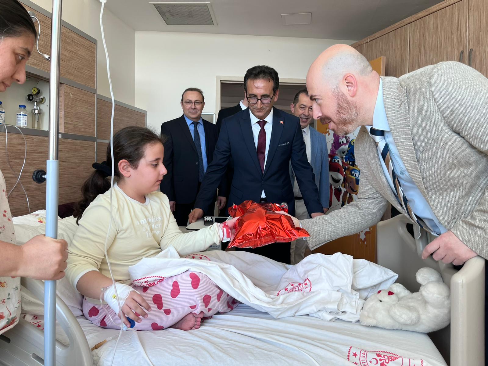 İl Millî Eğitim Müdürü Mehmet Çalışkan, İl Sağlık Müdürü Dr. Mehmet Serkan Yurdakul, Aile ve Sosyal Hizmetler İl Müdürü Nurettin Ulaş ile Başhekim Dr. Öğretim Üyesi Şükrü Salih Toprak, çocuk servisinde yatan minikleri ziyaret etti. Bayramı hastanede geçirmek zorunda kalan çocuklarla yakından ilgilenen protokol üyeleri, onların mutluluğuna ortak olarak moral verdi.