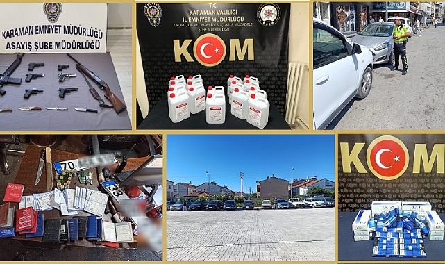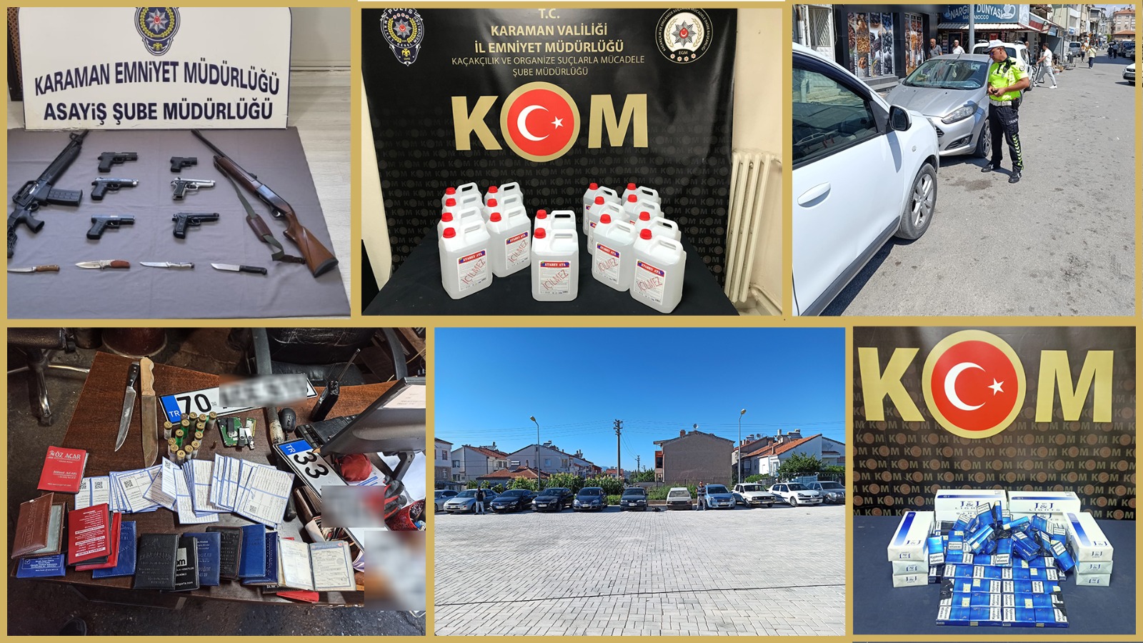 Denetimler esnasında, (6) adet ruhsatsız tabanca, (2) adet ruhsatsız tüfek, (4) adet kesici/delici alet, (1) adet çalıntı araç, (10) adet change olduğu değerlendirilen araç, (75) adet araç tescil belgesi, (3) adet hacizli yakalamalı araç plakası, (3) g uyuşturucu madde, (18) adet uyuşturucu madde emdirilmiş kağıt, (80) lt. etil alkol, (200) paket kaçak sigara, ele geçirildi.