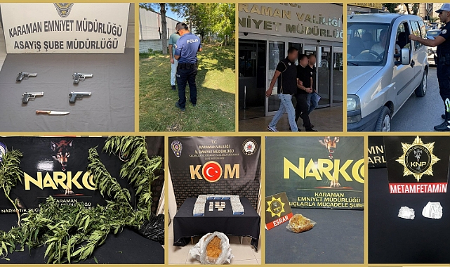 Denetimler esnasında, (4) adet ruhsatsız tabanca, (1) adet kesici/delici alet, (249) g uyuşturucu madde, (73) adet uyuşturucu hap, (2) kök kenevir maddesi, (15) kg bandrolsüz tütün, (5540) adet dolu makaron ele geçirildi.