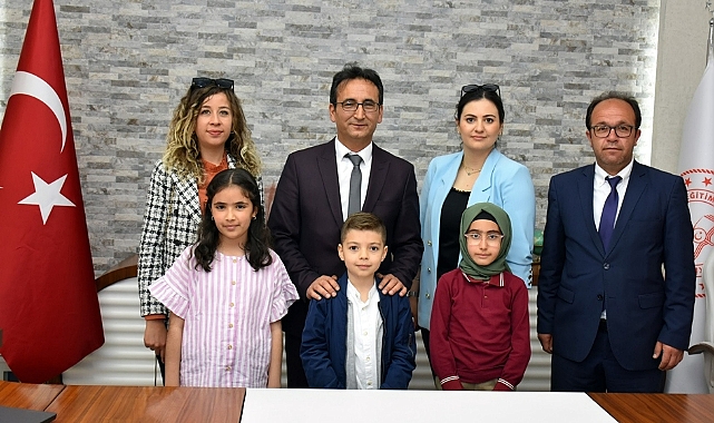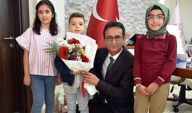 Okul Müdürü Ersin Özkan ve Sınıf Öğretmenleri Aliye Küçük Selvi ve Saadet Burcu Koçalan ile birlikte gelen İlyas Küçüker İlkokulu öğrencileri Hilal Yavuz, Rabia Ecem Tunç ve Mehmet Eren Öztürk, İl Müdürü Mehmet Çalışkan’a çiçek takdim etti. İl Millî Eğitim Müdürlüğü makamına gelen minik misafirlerini kapıda karşılayan İl Millî Eğitim Müdürü Mehmet Çalışkan, öğrencilerle yakından ilgilenerek makamını devretti.