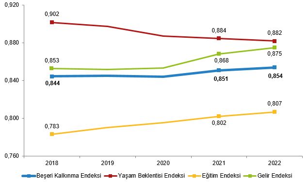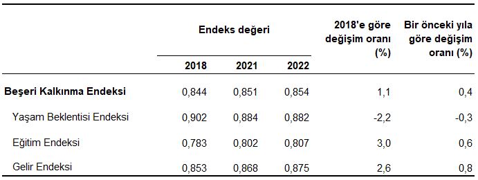 Beşeri kalkınma endeksi, 2018 yılında 0,844 iken 2022 yılında 2018'e göre %1,1 artarak 0,854 oldu. Bu değere göre Türkiye, Birleşmiş Milletler Kalkınma Programı tarafından belirlenen sınırlara göre "Çok Yüksek Gelişmişlik" seviyesindeki ülkeler grubunda yer aldı. Bu endeksin alt bileşenleri olan yaşam beklentisi endeksi 2022 yılında 2018'e göre %2,2 azalarak 0,882 olurken, eğitim endeksi ve gelir endeksi sırasıyla %3,0 ve %2,6 artışla 0,807 ve 0,875 oldu.