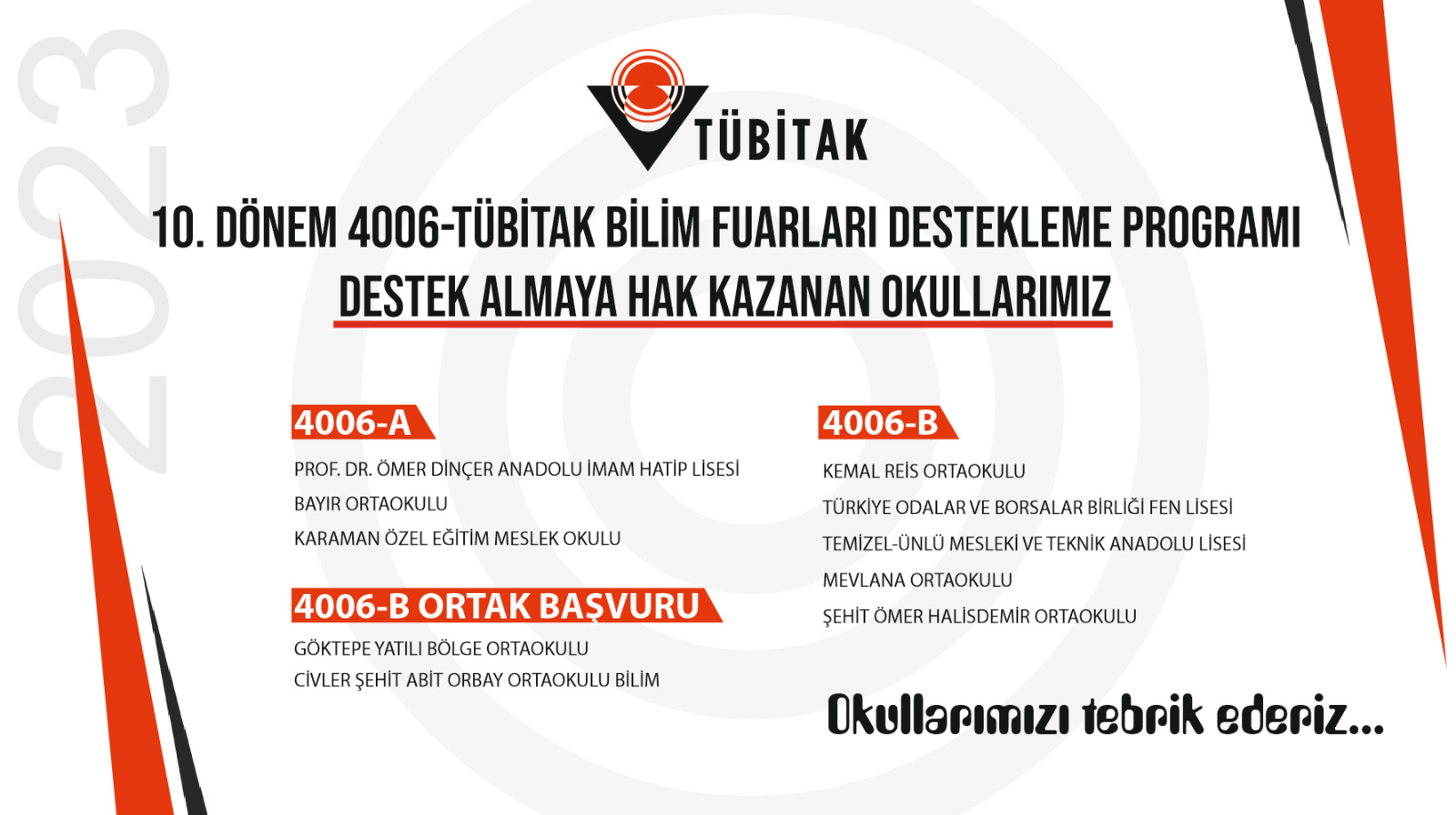Yapılan değerlendirme neticesinde; Prof. Dr. Ömer Dinçer Anadolu İmam Hatip Lisesi, Bayır Ortaokulu ve Karaman Özel Eğitim Meslek Okulu TÜBİTAK 4006-A bilim fuarı için destek almaya hak kazanırken; Türkiye Odalar ve Borsalar Birliği Fen Lisesi, Temizel-Ünlü Meslekî ve Teknik Anadolu Lisesi, Kemal Reis Ortaokulu, Mevlana Ortaokulu, Şehit Ömer Halisdemir Ortaokulu ile ortak başvuru yapan Göktepe Yatılı Bölge Ortaokulu ve Civler Şehit Abit Orbay Ortaokulu bilim fuarı için destek almaya hak kazanan okullar oldu.