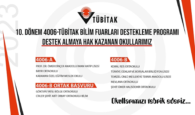 4006-TÜBİTAK 10. Bilim Fuarları kapsamında destek almaya hak kazanan proje listeleri il bazında yayınlandı. 4006-TÜBİTAK Bilim Fuarları Destekleme Programının 10’uncu Dönemi kapsamında 4006-A ve 4006-B çağrı başvurularının değerlendirme süreci sonucunda, programa Karaman’dan 10 okul destek almaya hak kazandı.