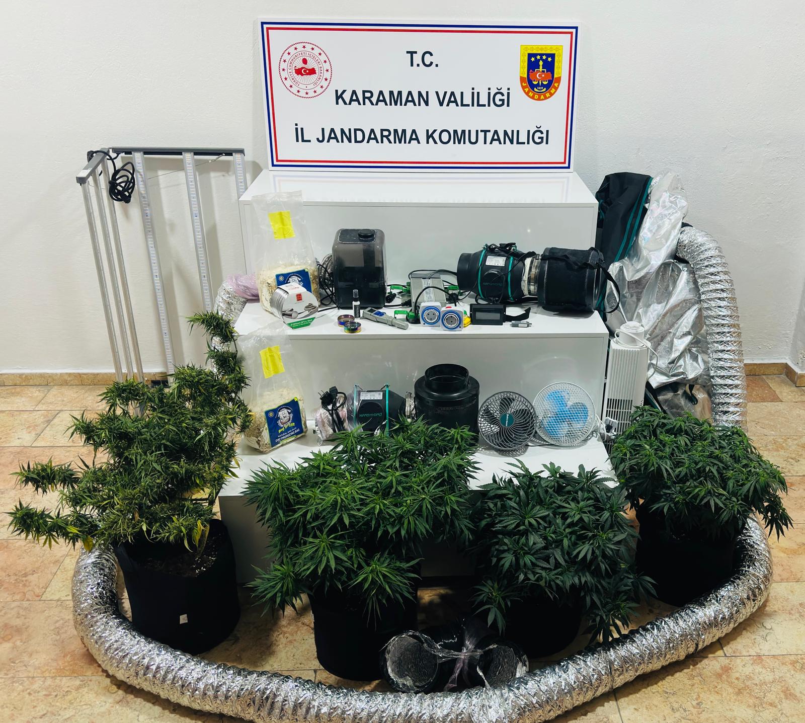 Karaman İl Jandarma Komutanlığı’nın 08 Temmuz 2025 tarihinde yürüttüğü Kaçakçılıkla Mücadele faaliyetleri kapsamında, Karaman merkez ilçede iklimlendirme yöntemiyle yasa dışı kenevir ekimi yaptığı tespit edilen B.Ç. isimli şüphelinin ikametgahında, adli makamlarla koordineli olarak arama gerçekleştirildi.