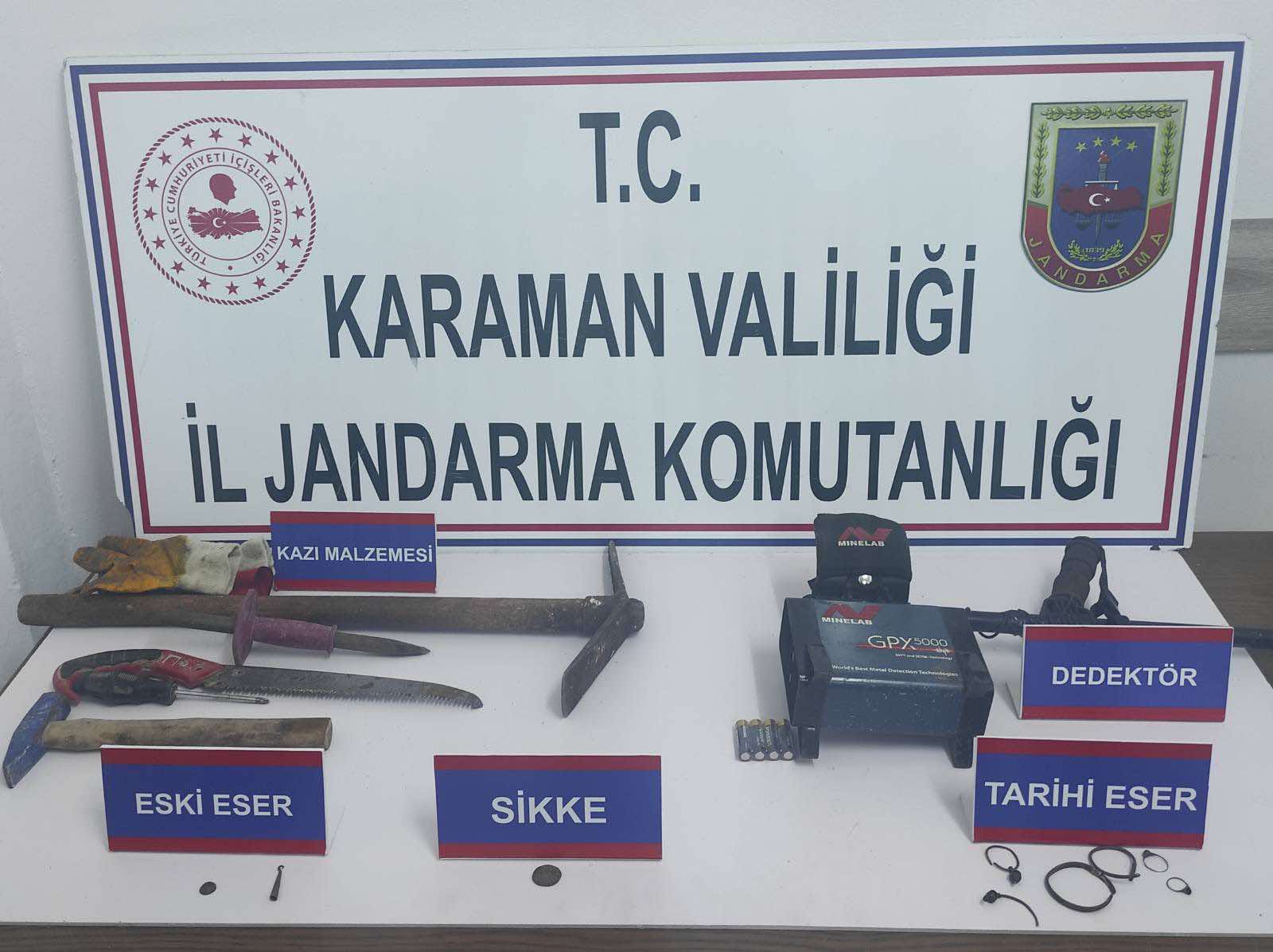 Ayrıca yapılan aramalarda; (5) adet ruhsatsız av tüfeği, (1) adet ruhsatsız tabanca, (1) adet kurusıkı tabanca, (3) adet piyade tüfeği fişeği, (406) adet tabanca fişeği, (2.806) adet av tüfeği fişeği, (17) gram kubar esrar, (30) adet sentetik hap (uyuşturucu), (16) gram kenevir tohumu, (1) adet dedektör, (9) adet tarihi eser obje, çeşitli kazı malzemeleri, (22.930) adet tütüne doldurulmuş makaron, (400) adet boş makaron ile doldurma aparatları ele geçirildi