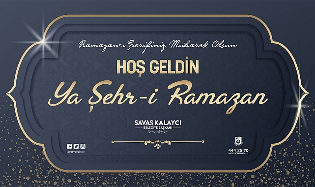 Belediye Başkanı Savaş Kalaycı, mesajında: “Rahmet, mağfiret ve bereket ayı olan on bir ayın sultanı Ramazan’a kavuşmanın sevincini yaşarken, mübarek Ramazan-ı Şerif’in; şehrimize, ülkemize ve milletimize hayırlara vesile olmasını diliyoruz. Ramazan Ayı’nın manevi atmosferini hep birlikte paylaştığımız güzelliklerle dolu bu mübarek ayda; kalplerimizden sevgiyi, sofralarımızdan bereketi, evlerimizden huzur ve saadeti eksik etmemesini Yüce Allah’tan niyaz ediyorum. Cenab-ı Hakkın bizleri sağlık, esenlik, birlik ve beraberlik içinde Ramazan Bayramı’na kavuşturması temennisiyle tüm İslam Âleminin Ramazan Ayı’nı tebrik ediyor, Karamanlı hemşehrilerimi sevgi, saygı ve en kalbi duygularla selamlıyorum” dedi.