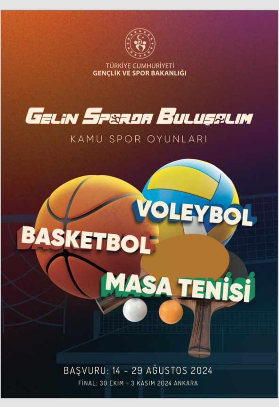 KAMU SPOR OYUNLARI BAŞLIYORBu yıl ikincisi düzenlenecek ‘Kamu Spor Oyunları’ için başvurular başladı.Gençlik ve Spor Bakanlığı bünyesinde, toplumun tüm kesimlerini spor alanlarına çekmek için hayata geçirdiği Gelin Sporda buluşalım ‘Kamu Spor Oyunları’ için başvurular 14-29 Ağustos 2024 tarihlerinde yapılacak.Karaman’da Gençlik ve Spor İl Müdürlüğü koordinesinde düzenlenecek ve kamu kurumlarında çalışanlar arasında oluşturulacak kadrolar ile mücadele edilecek turnuvada voleybol, basketbol ve masa tenisi branşlarında müsabakalar yapılacak.Turnuvada mücadele etmek isteyen kamu kurumları başvurularını Gençlik ve Spor İl Müdürlüğüne yapacaklar. Başvuruların sona ermesinin ardından yapılacak teknik toplantı ile fikstürler belli olacak ve maçlar başlayacak.Karaman’da yapılacak bölge finallerinin ardından dereceye giren takımlar 30 Ekim ile 3 Kasım tarihleri arasında Ankara’da yapılacak Türkiye finallerinde mücadele etmeye hak kazanacak.