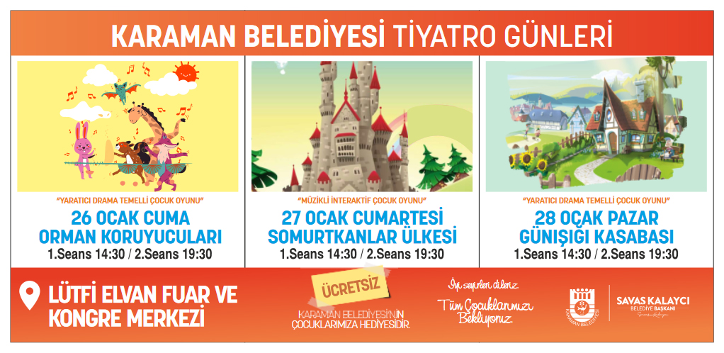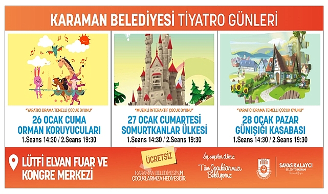 Her fırsatta çocuklar için çeşitli faaliyetler gerçekleştiren Karaman Belediyesi, yarı yıl tatilinde de öğrencileri unutmadı. Çocukların keyifle izleyeceği üç farklı oyununun sahneleneceği tiyatro etkinliği, Lütfi Elvan Fuar ve Kongre Merkezi'nde sahnelenecek. Üç gün boyunca her gün iki seans ve ücretsiz olarak düzenlenen tiyatroya tüm çocuklar ve aileleri davet edilirken, oyunlar ve seanslar şu şekilde olacak.