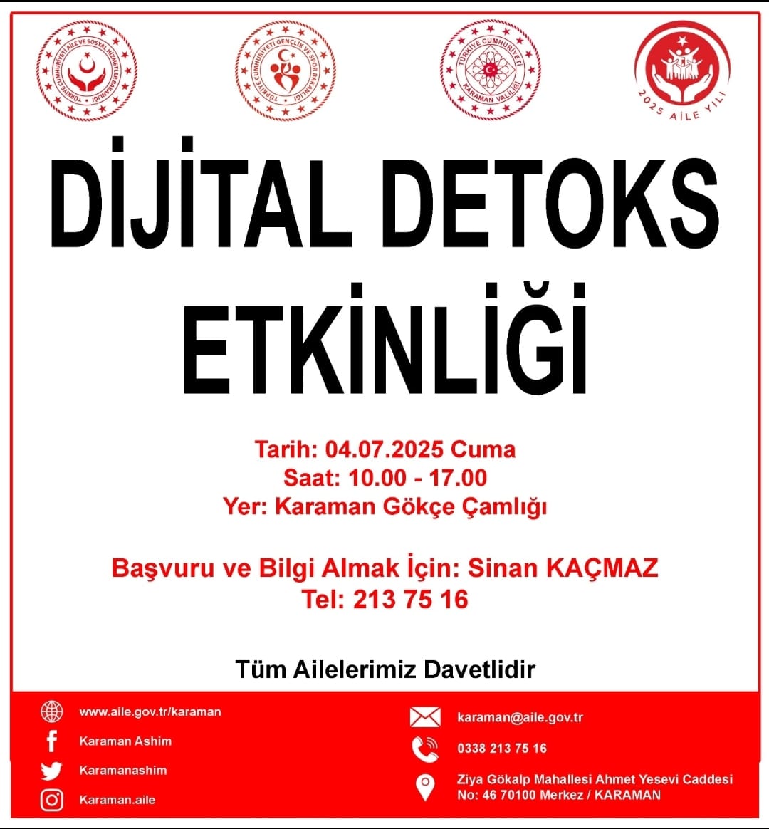 Aile ve Sosyal Hizmetler İl Müdürlüğü, 2025 yılının "Aile Yılı" ilan edilmesi kapsamında anlamlı bir etkinliğe imza atıyor. Teknolojik cihazlardan ve ekranlardan uzaklaşarak aile bağlarını güçlendirmek, yüz yüze iletişimi artırmak ve birlikte nitelikli zaman geçirilmesini teşvik etmek amacıyla 04 Temmuz 2025 Cuma günü, Karaman Gökçe Çamlığı’nda “Dijital Detoks Etkinliği” düzenlenecek.