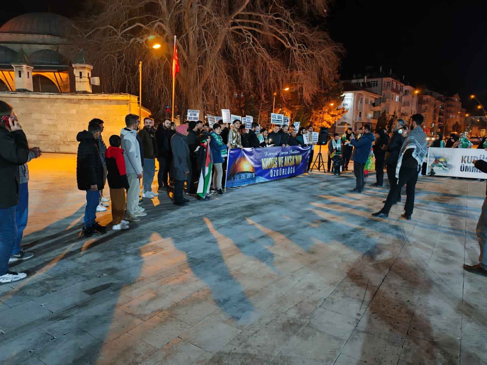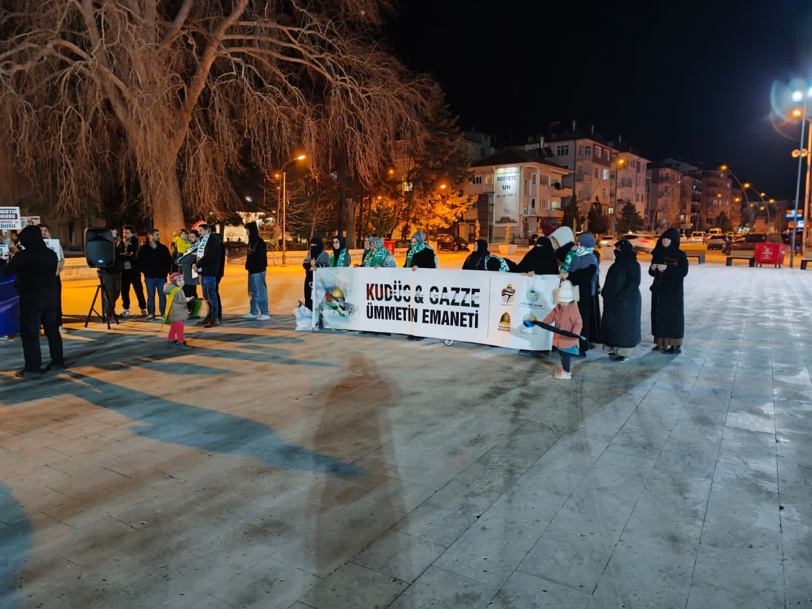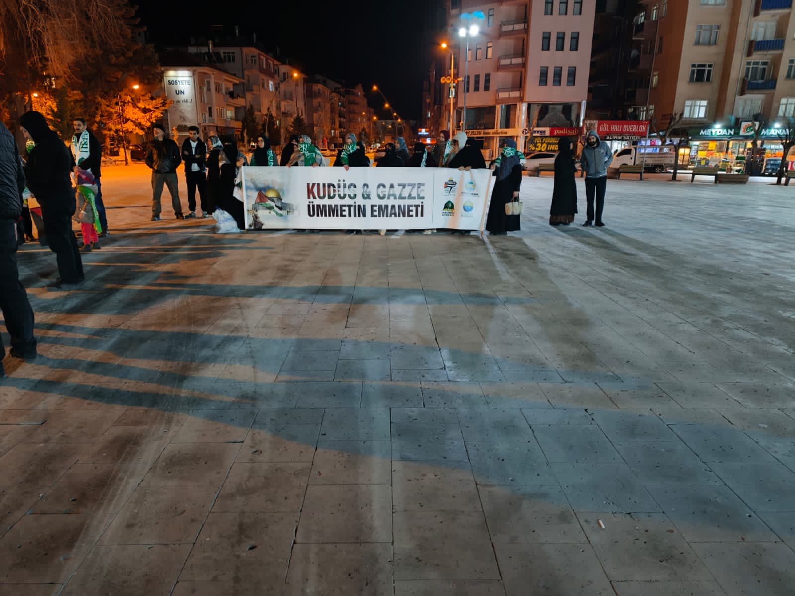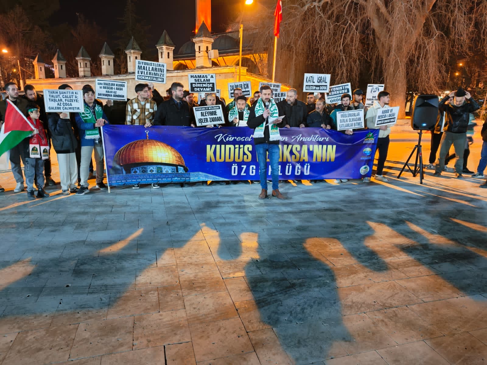 Karaman’da Dünya Kudüs Günü dolayısıyla Aktekke Meydanı’nda basın açıklaması düzenlendi. Teravih namazının ardından meydanda toplanan vatandaşlar, Mescid-i Aksa’nın özgürlüğü ve Gazze’de yaşanan olaylara dikkat çekmek amacıyla bir araya geldi.Etkinlikte konuşma yapan organizasyon temsilcileri, Kudüs’ün ve Mescid-i Aksa’nın Müslümanlar için taşıdığı öneme vurgu yaparak, bölgede yaşanan gelişmeler konusunda toplumsal duyarlılığın artırılması gerektiğini ifade etti. Açıklamada, Filistin halkının yaşadığı sıkıntılara dikkat çekilirken uluslararası kamuoyuna da çağrıda bulunuldu.Kadın, erkek, genç ve yaşlı çok sayıda vatandaşın katıldığı basın açıklamasında katılımcılar çeşitli sloganlar atarak Kudüs ve Gazze’ye destek mesajları verdi. Programda yapılan konuşmaların ardından dua edildi.