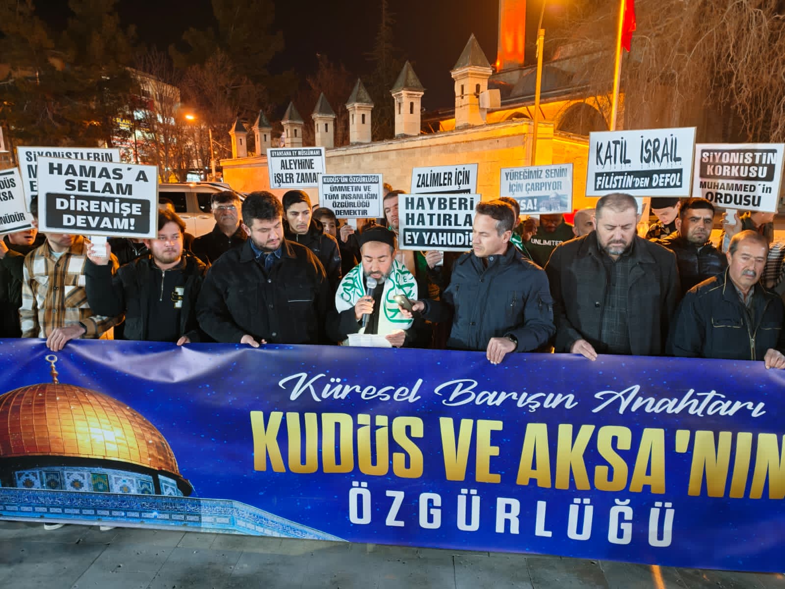 Karaman’da Dünya Kudüs Günü kapsamında Aktekke Meydanı’nda bir araya gelen vatandaşlar, Mescid-i Aksa’nın özgürlüğü ve Gazze’de yaşananlara dikkat çekmek amacıyla basın açıklaması gerçekleştirdi.