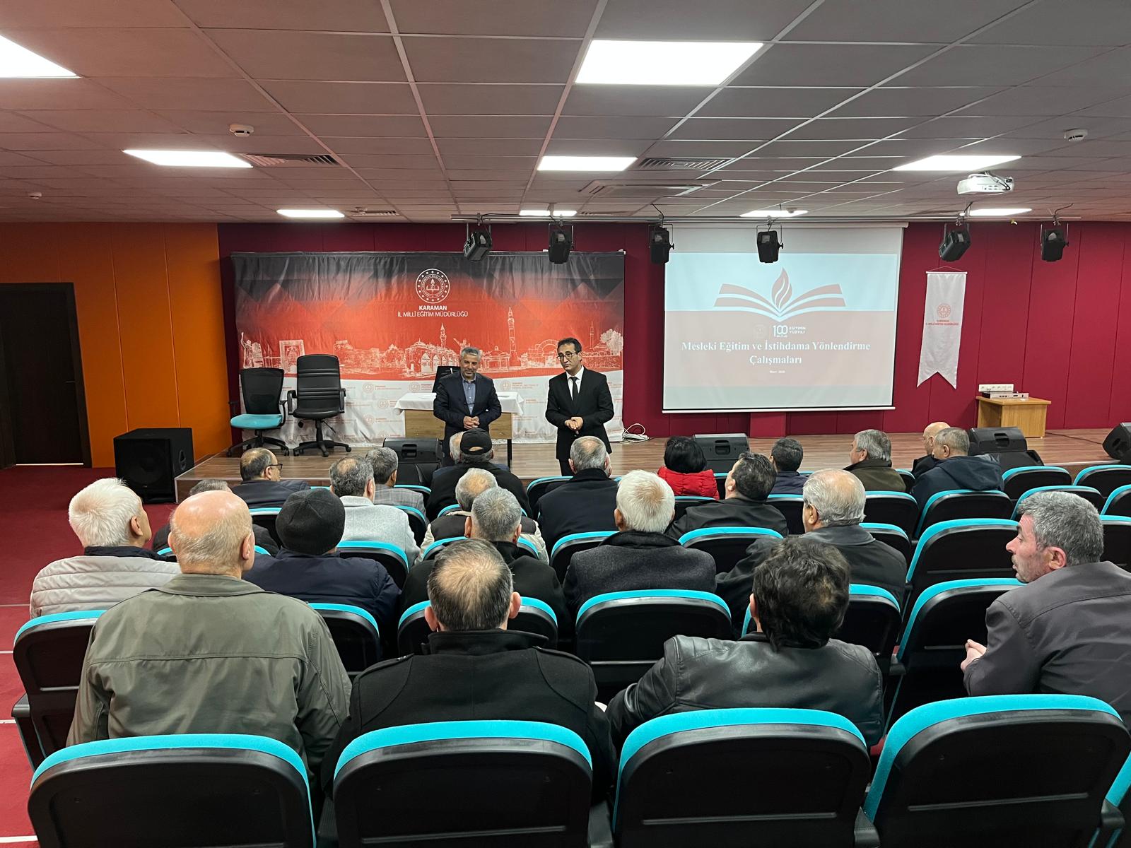 İl Millî Eğitim Müdürlüğü Konferans Salonu’nda düzenlenen toplantıya İl Millî Eğitim Müdürü Mehmet Çalışkan, İl Millî Eğitim Şube Müdürü Halil Sanlı ve Karaman merkezde görev yapan mahalle muhtarları katıldı. Toplantıda, 8. sınıftan mezun olan öğrencilerin ortaöğretime kayıtlarının sağlanması, ortaöğretimde kaydı bulunmasına rağmen çeşitli nedenlerle eğitim hayatına devam etmeyen öğrencilerin yeniden sisteme kazandırılması ve 15–24 yaş aralığında örgün eğitim dışında kalan gençlerin mesleki eğitim kursları aracılığıyla istihdama kazandırılması konuları değerlendirildi.