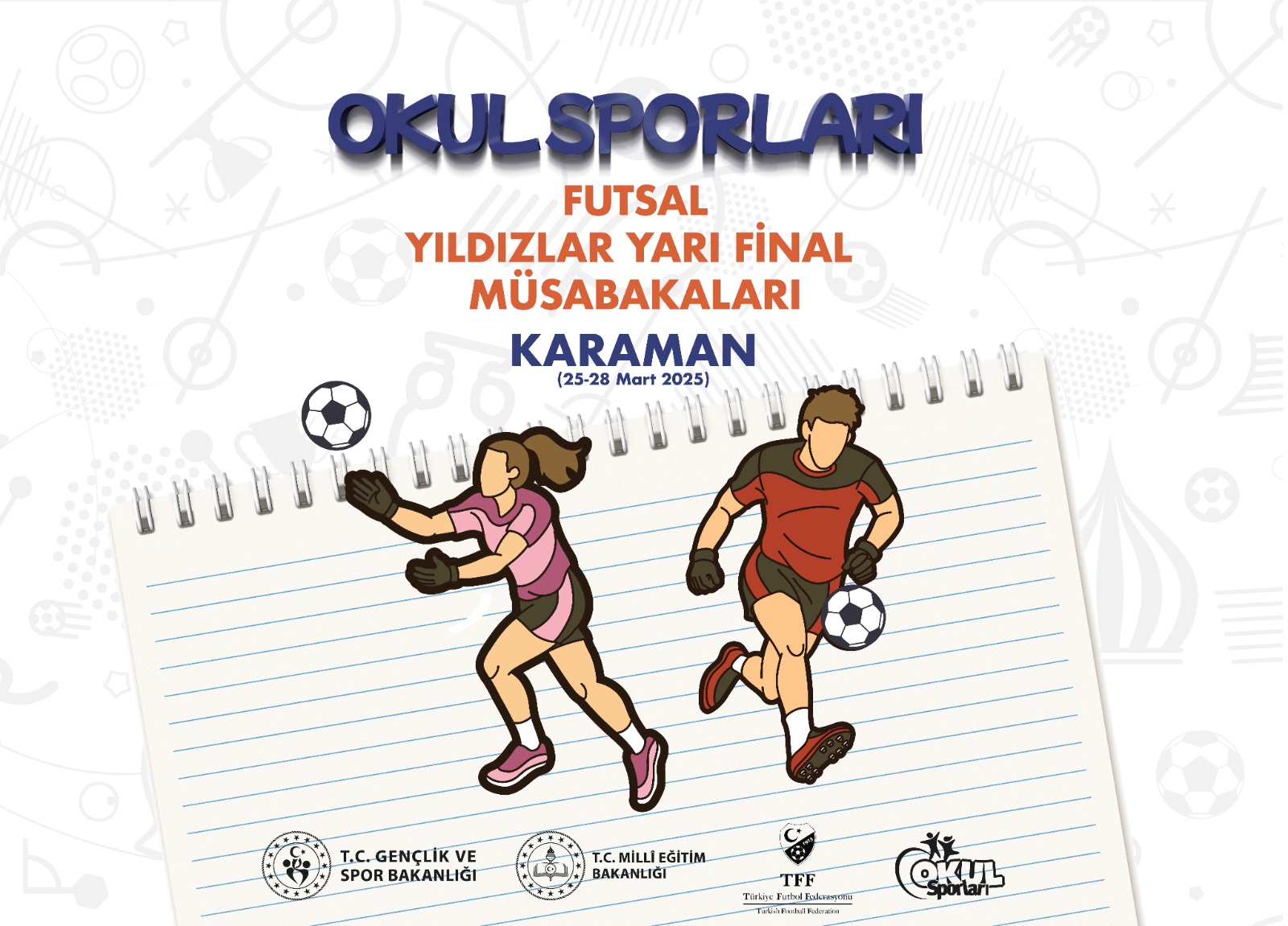 Gençlik ve Spor Bakanlığı Okul Sporları Daire Başkanlığı’nın 2025 yılı faaliyet programında yer alan Okul Sporları Futsal Yarı Final Müsabakaları, 25-28 Mart 2025 tarihleri arasında Karaman’da gerçekleştirilecek. Kızlar ve erkekler kategorilerinde toplam 16 takımın mücadele edeceği müsabakalara Karaman, ev sahipliği yapacak.