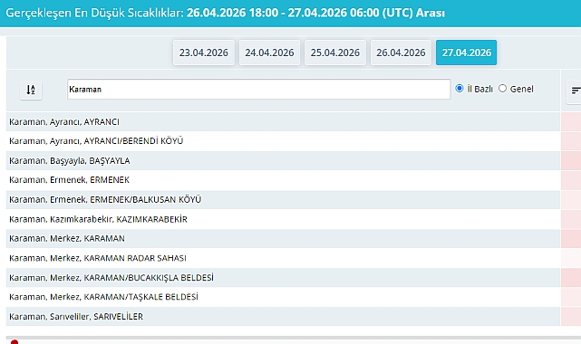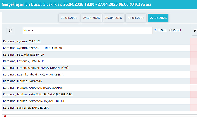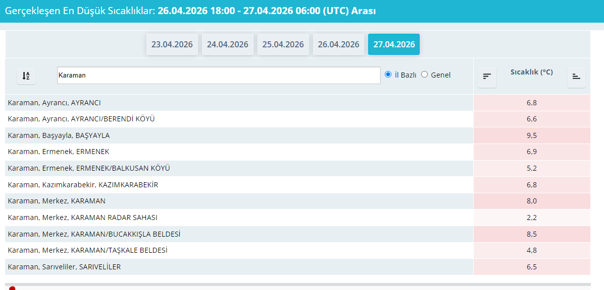 Karaman genelinde 27 Nisan 2026 tarihinde ölçülen en düşük sıcaklık değerleri dikkat çekti. İl genelinde farklı noktalarda yapılan ölçümlere göre, en düşük sıcaklık Karaman Merkez Radar Sahası’nda 2,2 derece olarak kaydedildi.