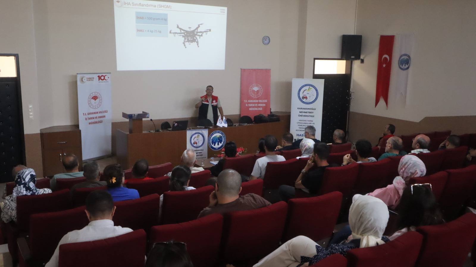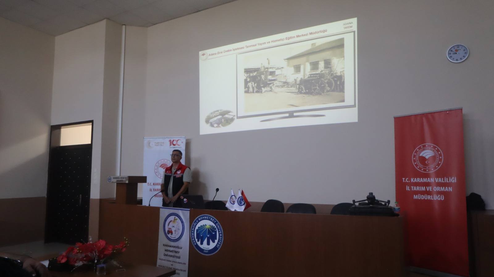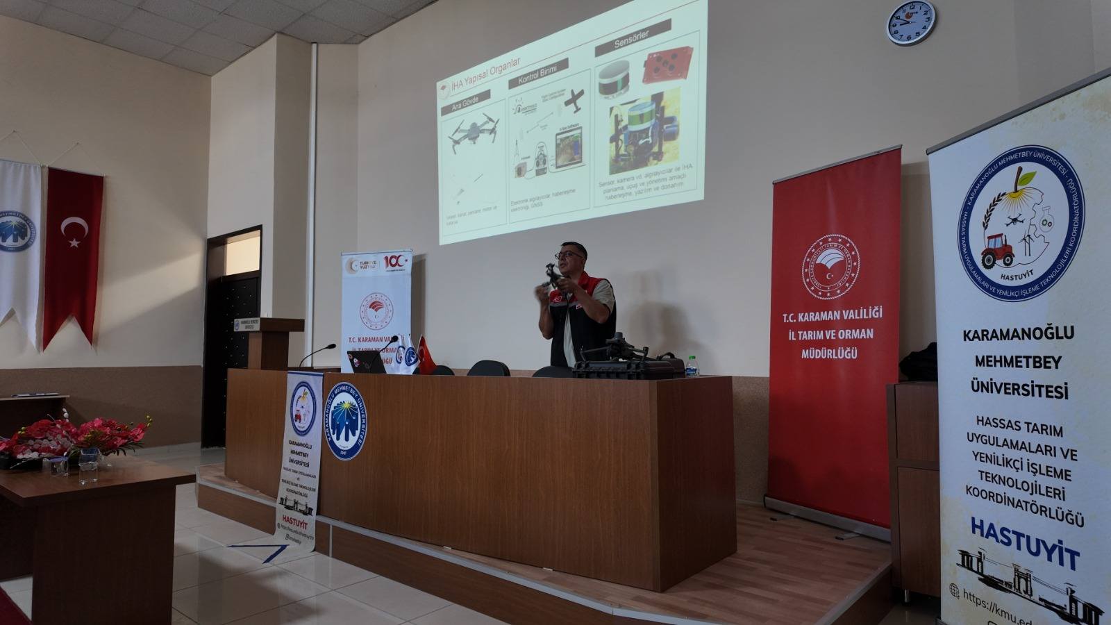 Karaman İl Tarım ve Orman Müdürlüğü ile Karamanoğlu Mehmetbey Üniversitesi iş birliğinde, tarımda teknolojik yeniliklerin kullanımını teşvik etmek amacıyla “Tarımda Drone Uygulamaları” konulu söyleşi düzenlendi.