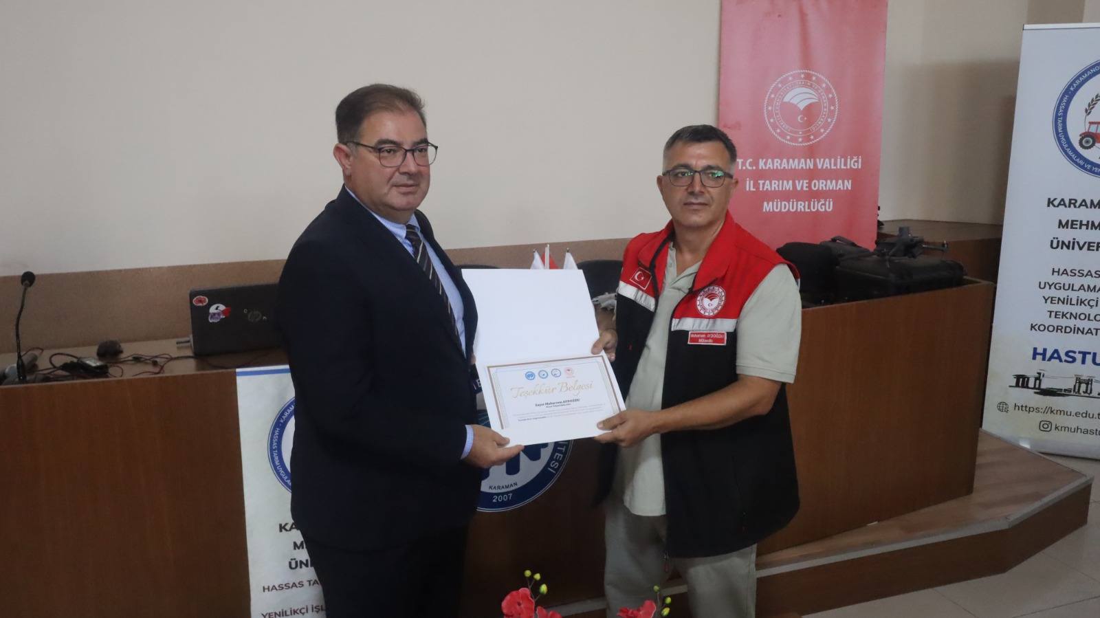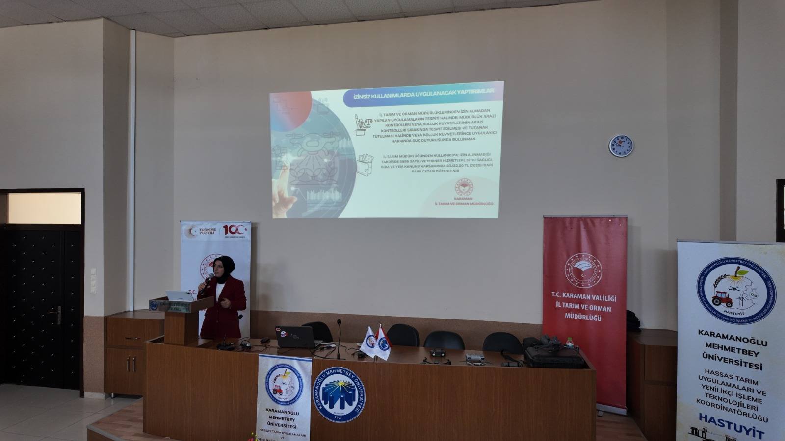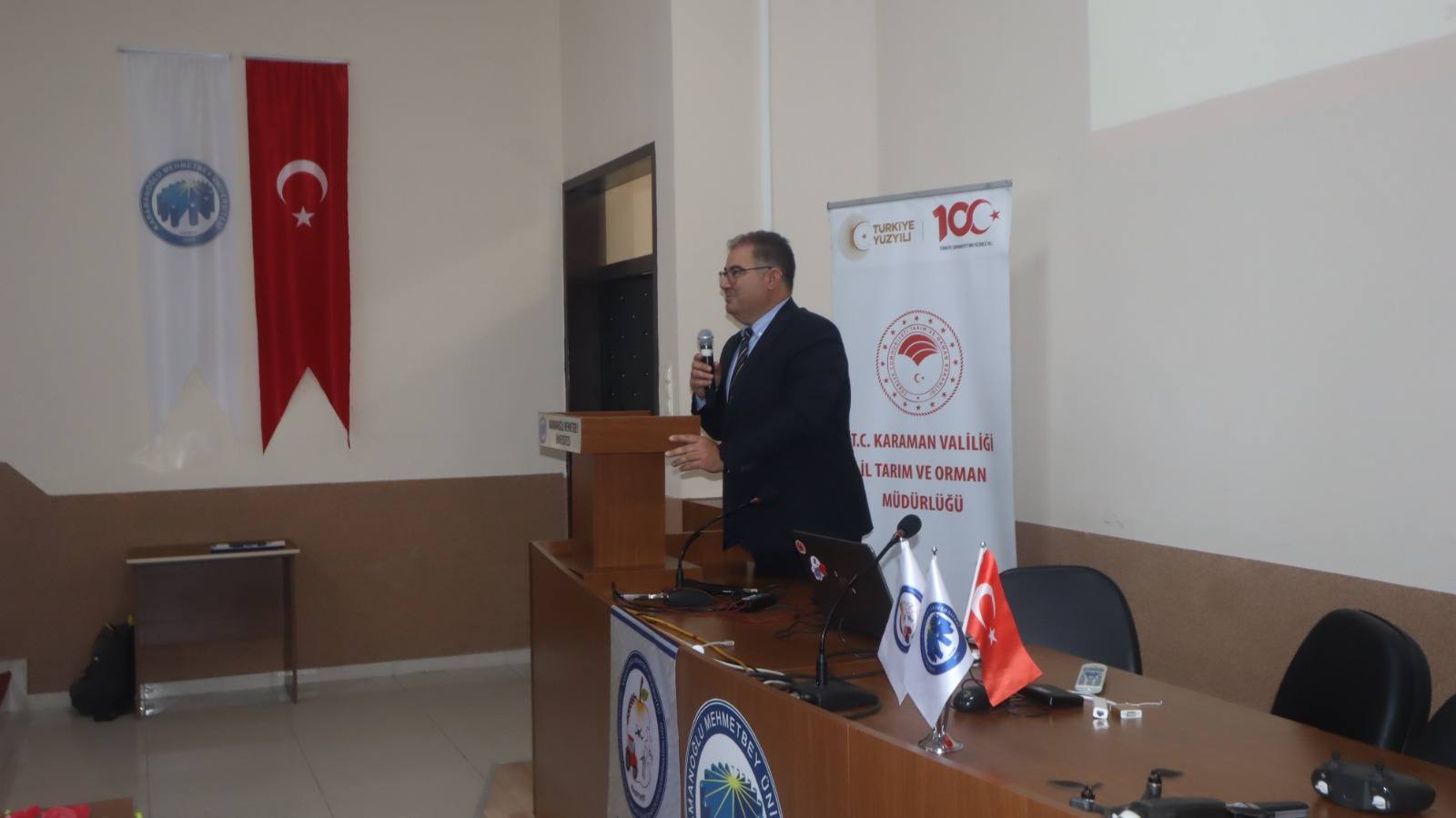 Karaman İl Tarım ve Orman Müdürlüğü ile Karamanoğlu Mehmetbey Üniversitesi iş birliğinde, tarımda teknolojik yeniliklerin kullanımını teşvik etmek amacıyla “Tarımda Drone Uygulamaları” konulu söyleşi düzenlendi.
