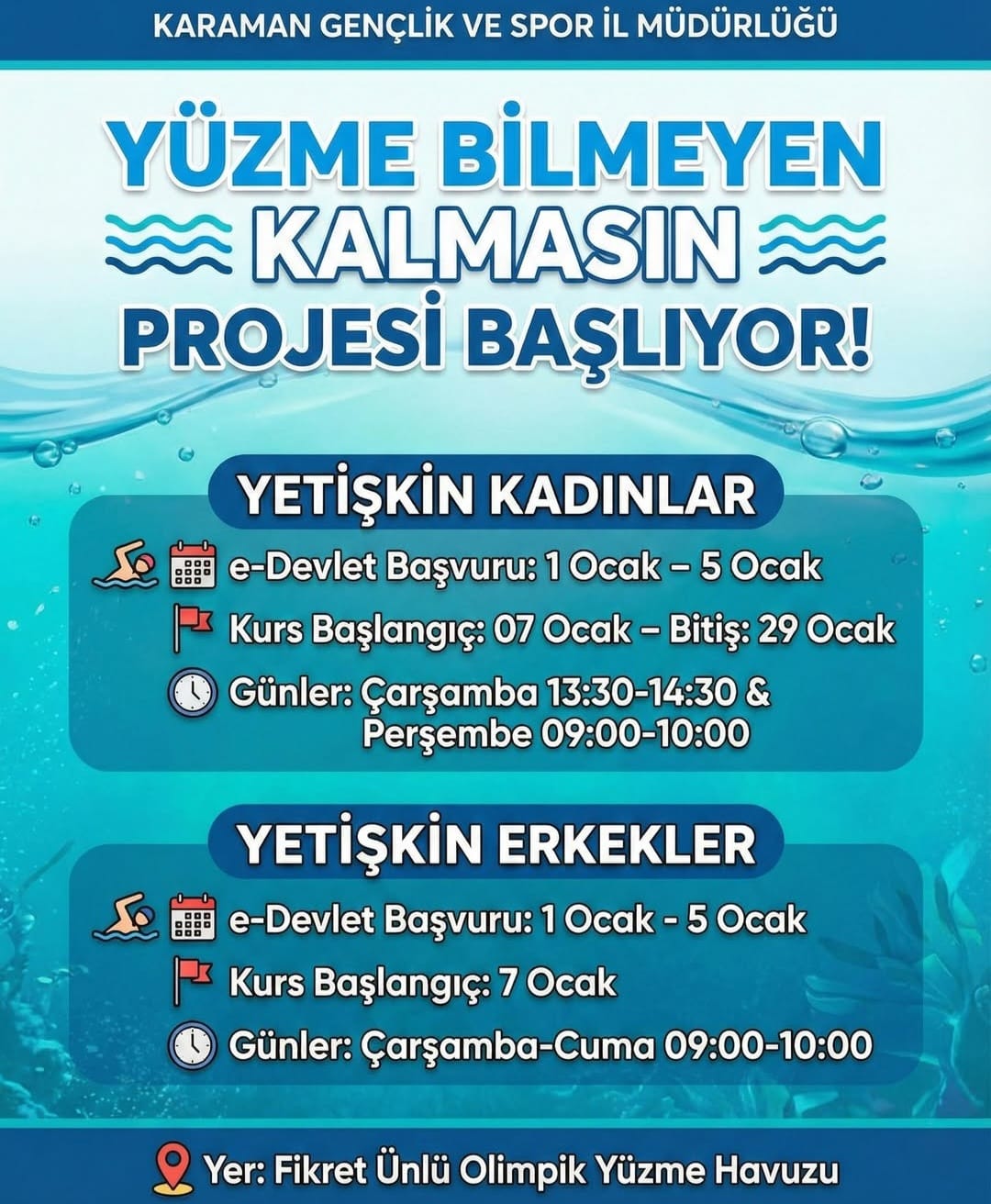 Karaman Gençlik ve Spor İl Müdürlüğü, “Yüzme Bilmeyen Kalmasın” projesi kapsamında yetişkinlere yönelik ücretsiz yüzme kurslarını başlatıyor. Proje ile yüzme öğrenmek isteyen yetişkinlerin spora teşvik edilmesi ve sağlıklı yaşam alışkanlıklarının desteklenmesi amaçlanıyor.