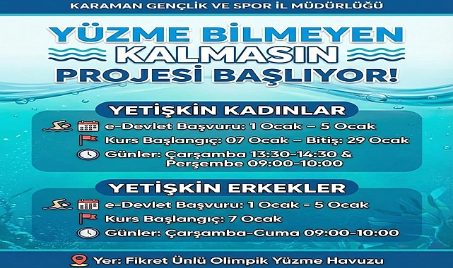 Karaman Gençlik ve Spor İl Müdürlüğü yetkilileri, yüzme öğrenmek isteyen tüm yetişkinleri projeye başvurmaya davet ederken, sporun her yaşta mümkün olduğuna dikkat çekti.